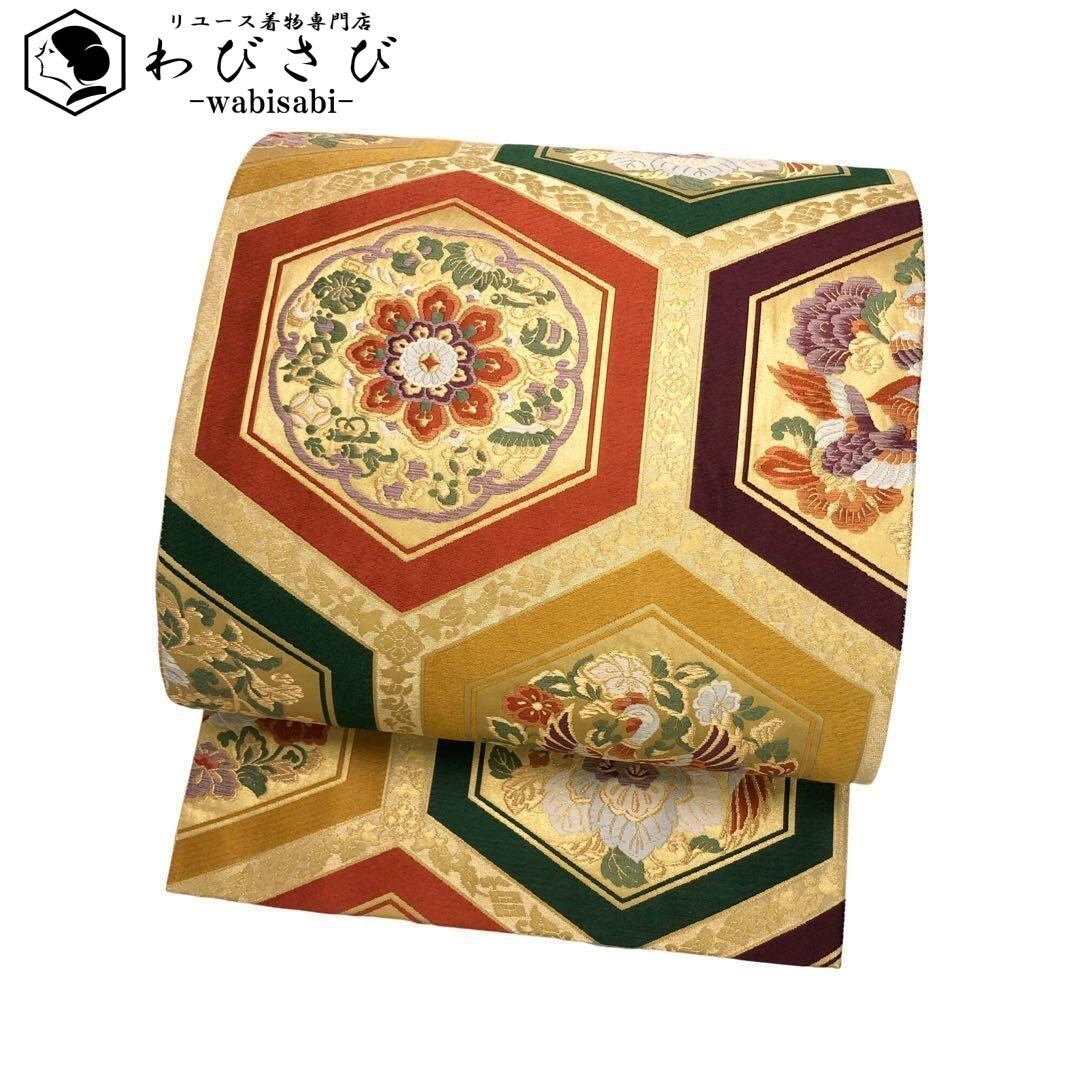 袋帯 本漆本金箔 亀甲正倉文様 美しい鳥に花柄模様 金色 O-3288 着物 きもの kimono 和服 和装 中古 リサイクル着物 【送料無料】