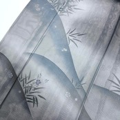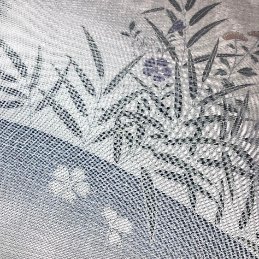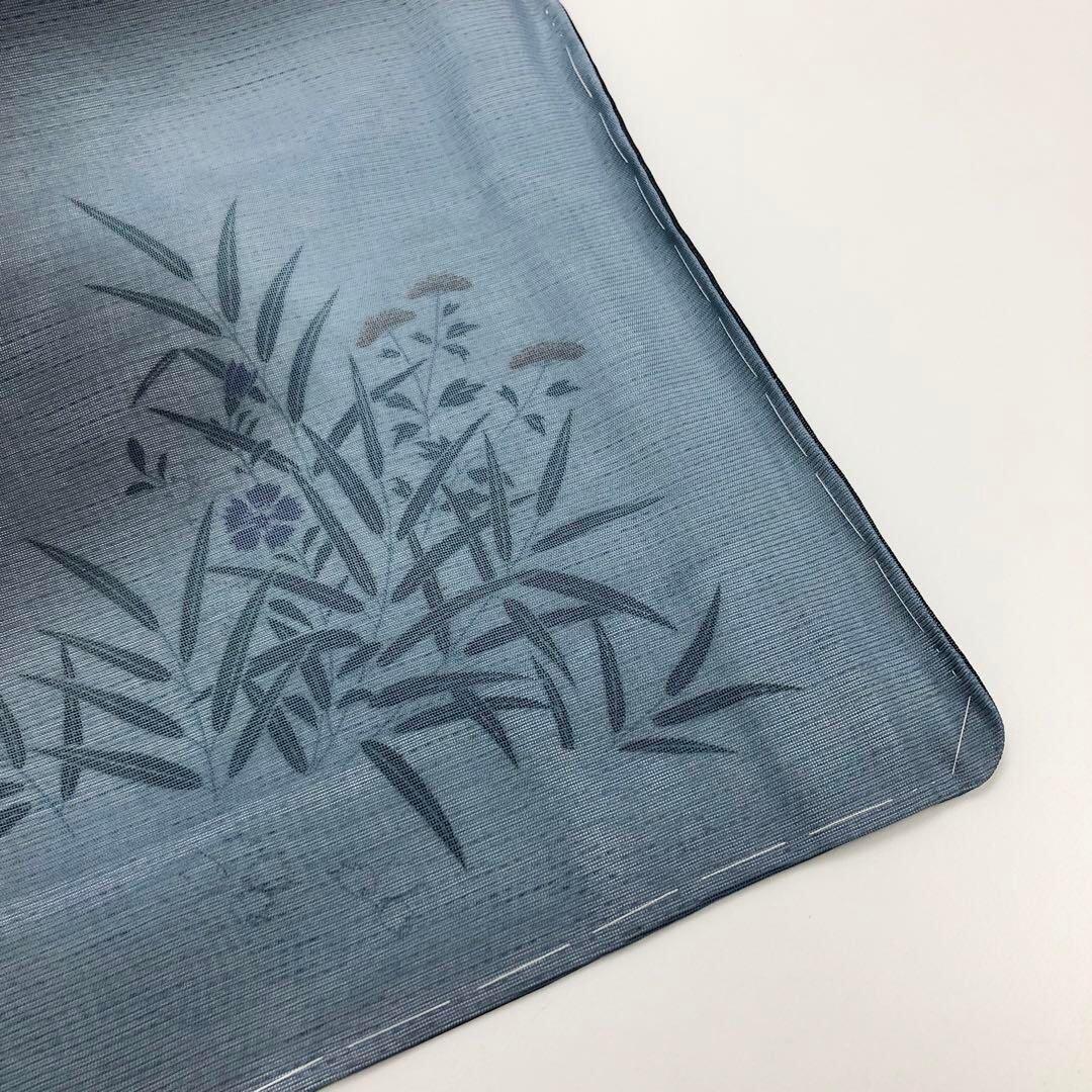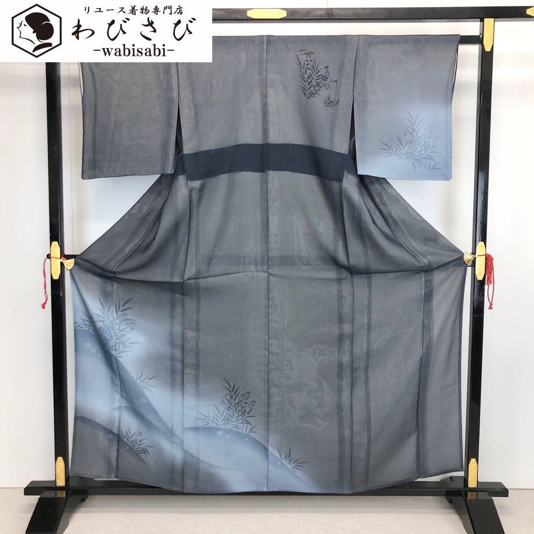 紗と絽が合わさった透け感のある紺色ベースのお色味から白地の絽の生地に描かれた上品な花草模様がさり気なく浮かび上がるデザインの素敵な柄裄のお品でございます。