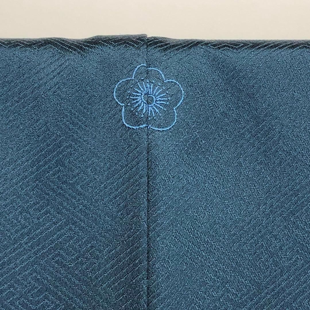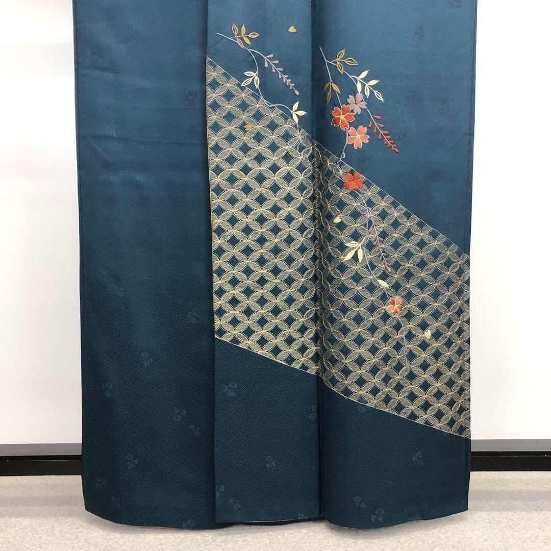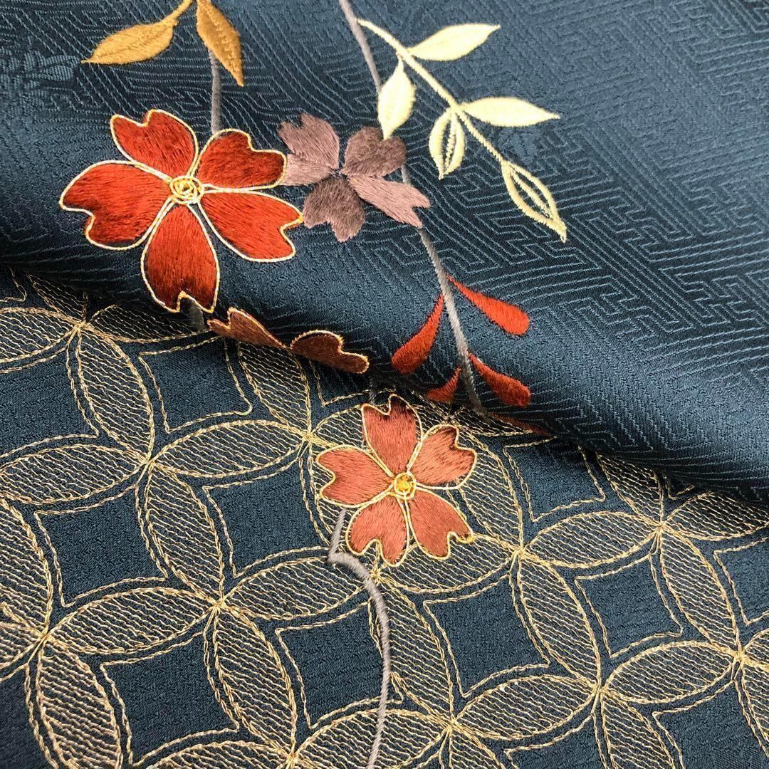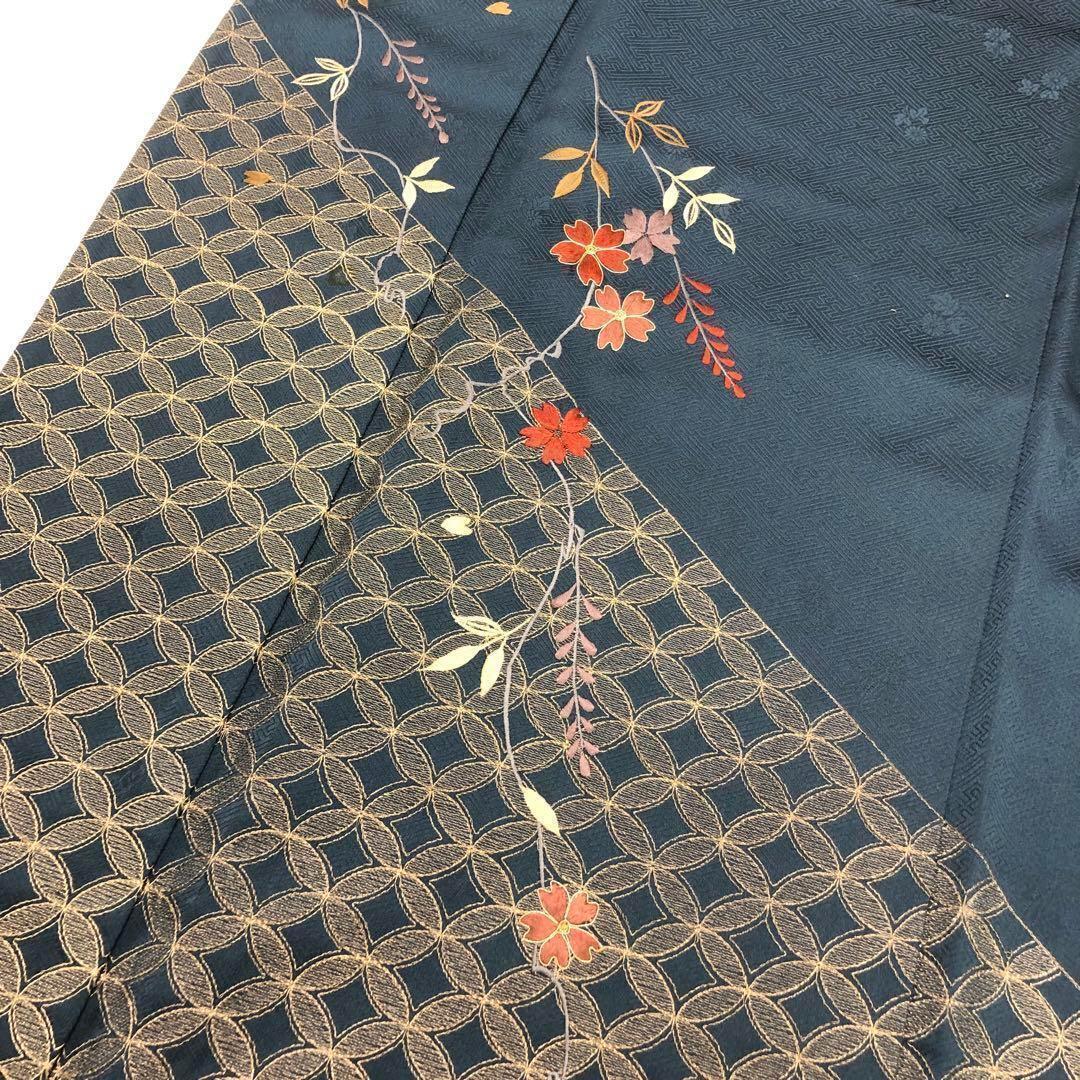 潤色の落ち着きのある青味のお色に紗綾形の地模様、七宝繋ぎに桜の花模様が全て刺繍でデザインされた素敵な柄裄のお品でございます。