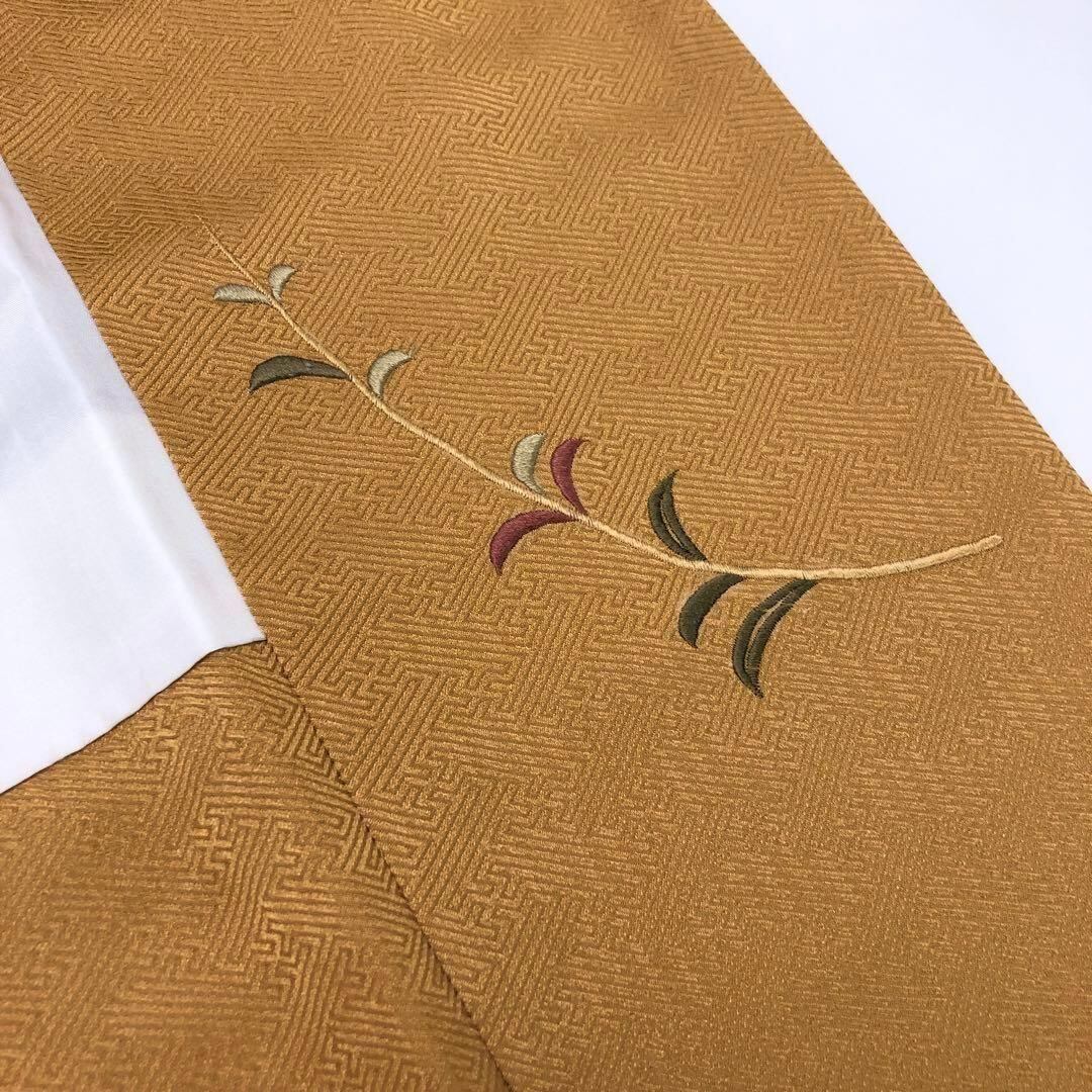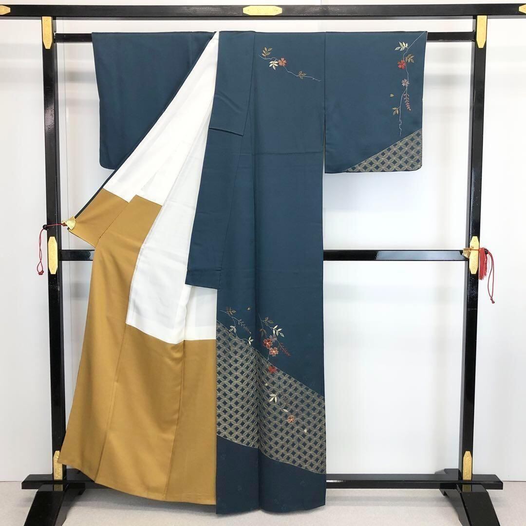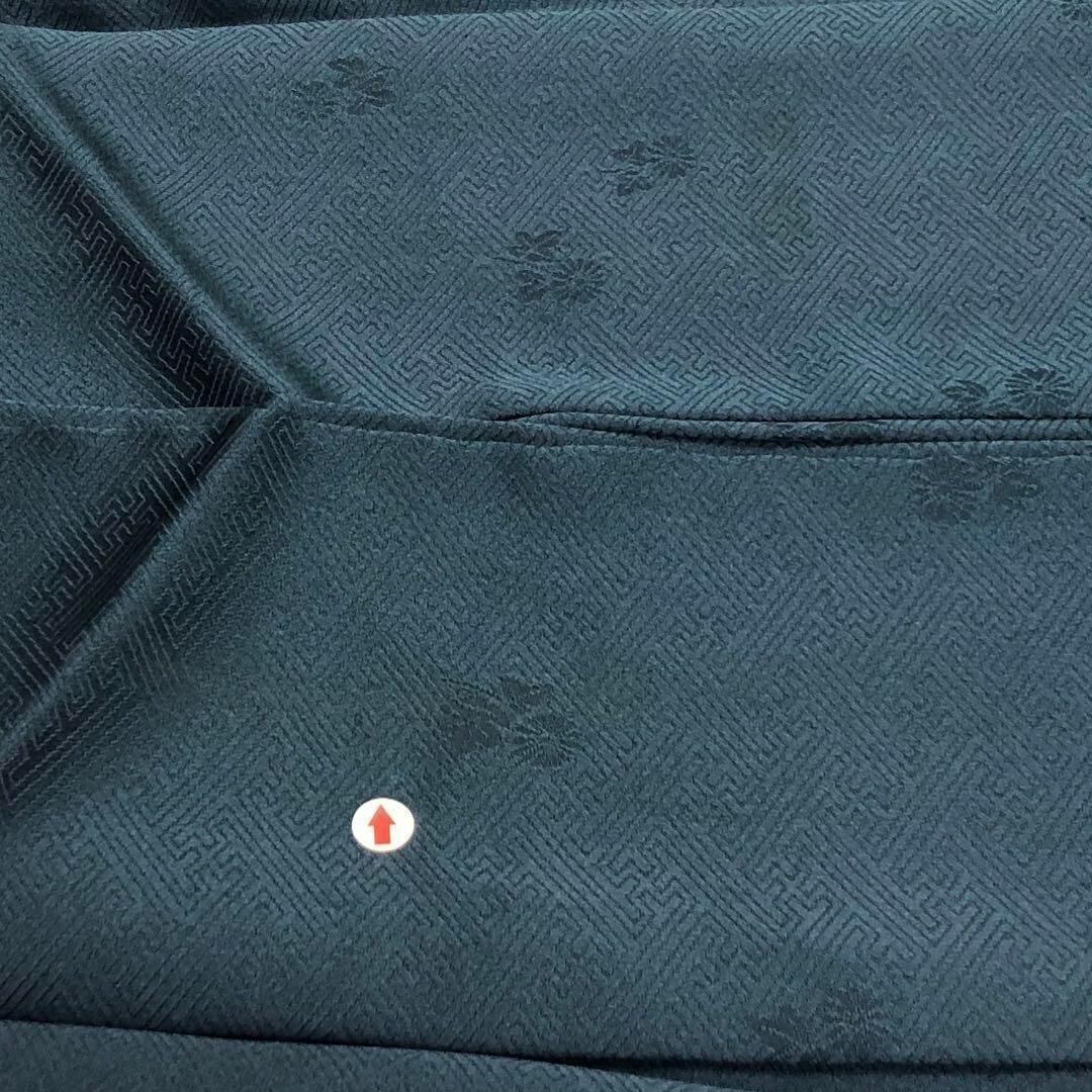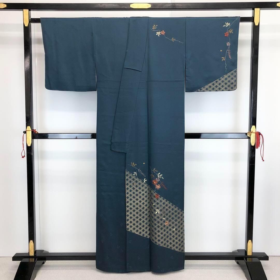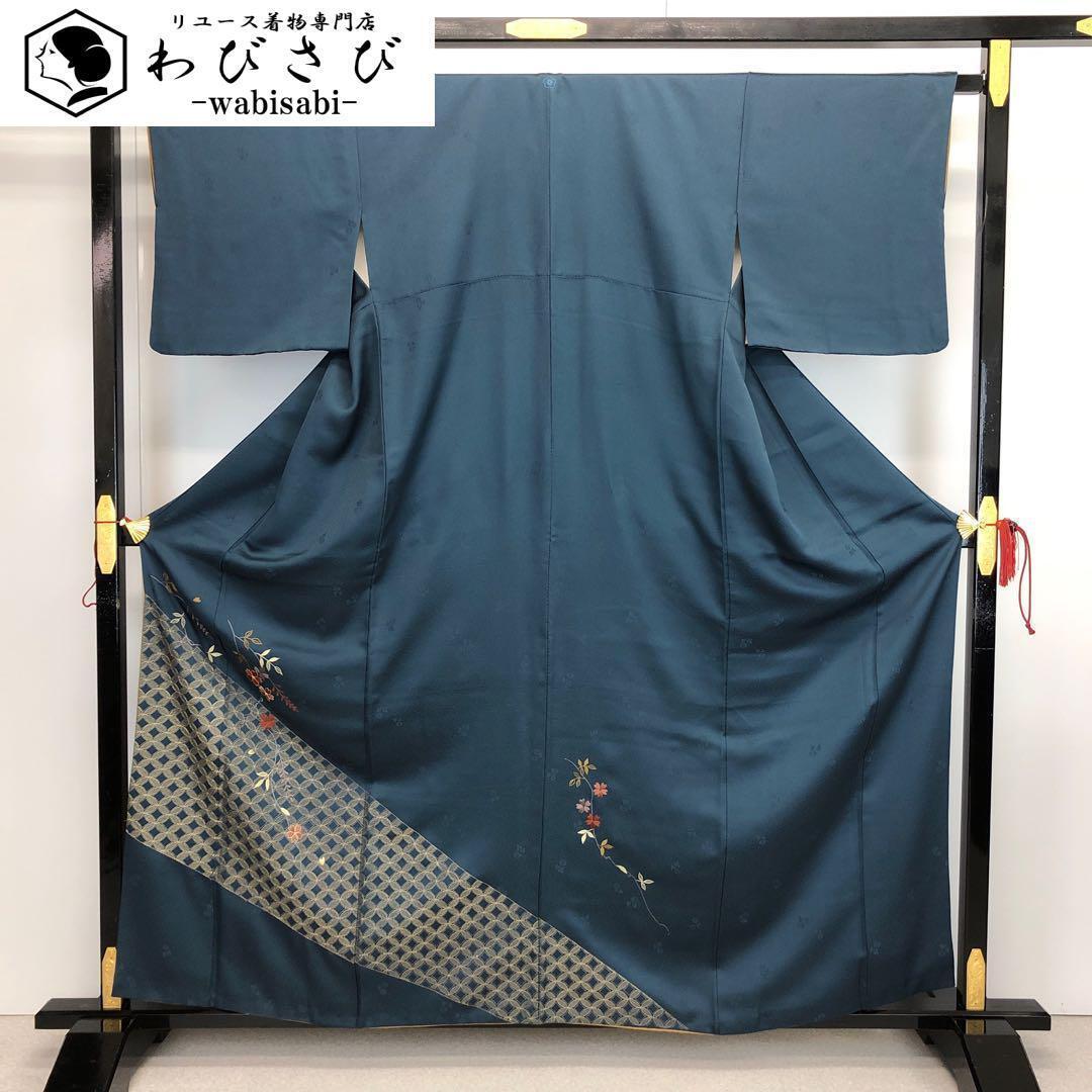 潤色の落ち着きのある青味のお色に紗綾形の地模様、七宝繋ぎに桜の花模様が全て刺繍でデザインされた素敵な柄裄のお品でございます。