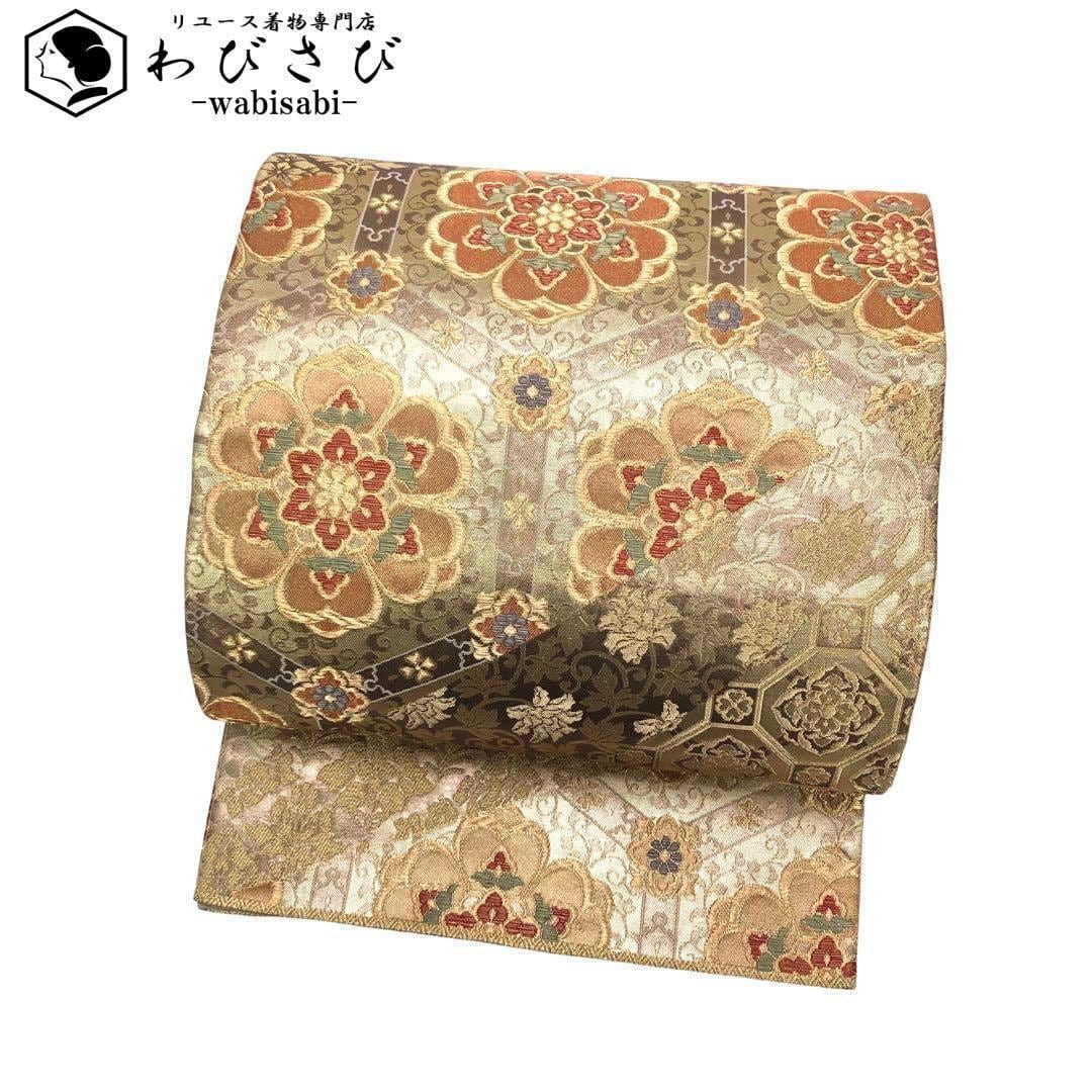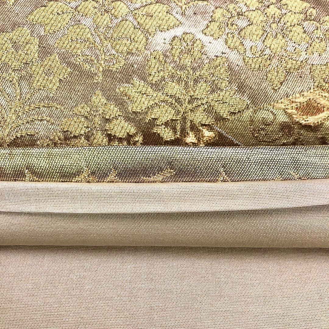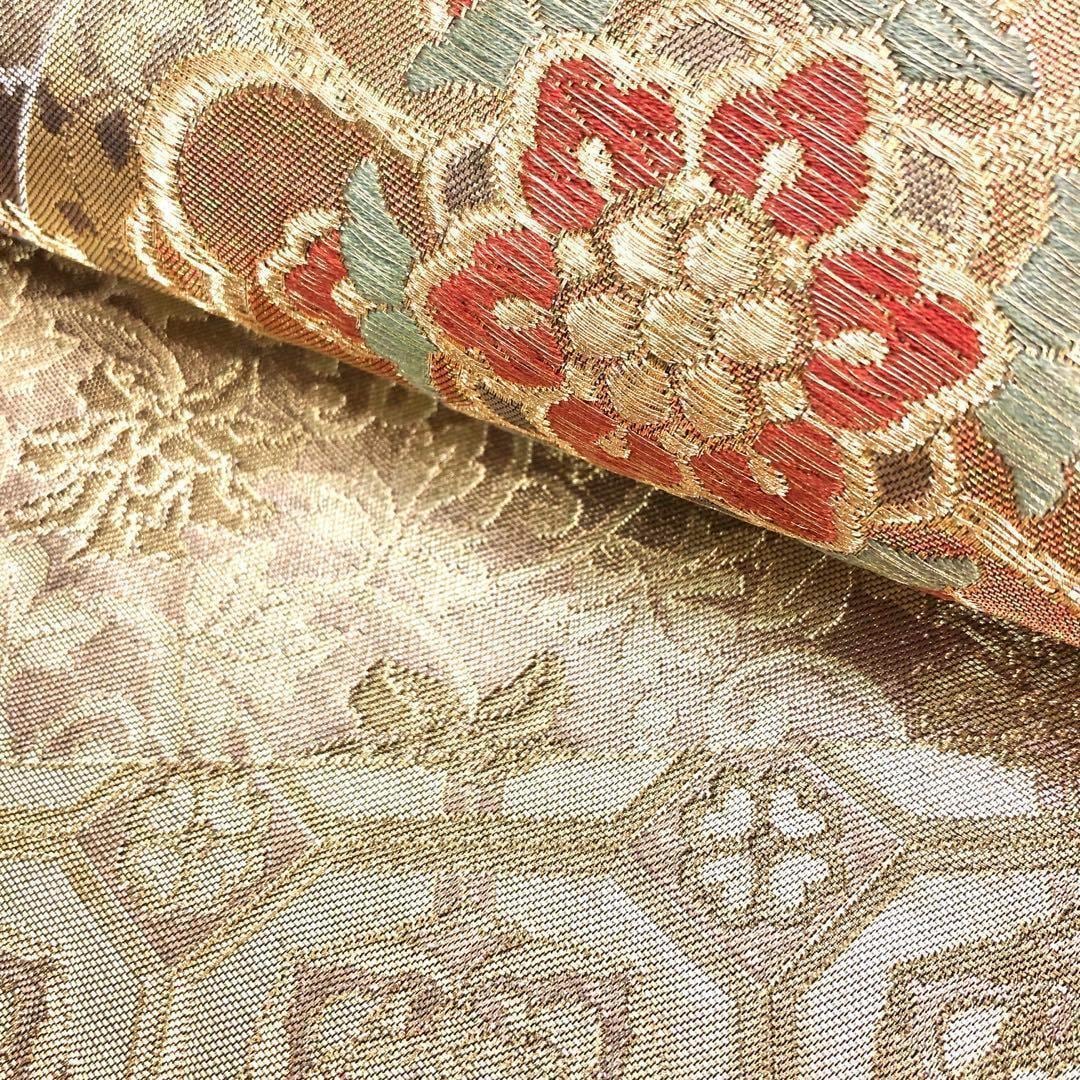 金色ベースのお色味に煌びやかで美しい六角に華柄の織模様がデザインされた素敵な柄裄のお品でございます。
