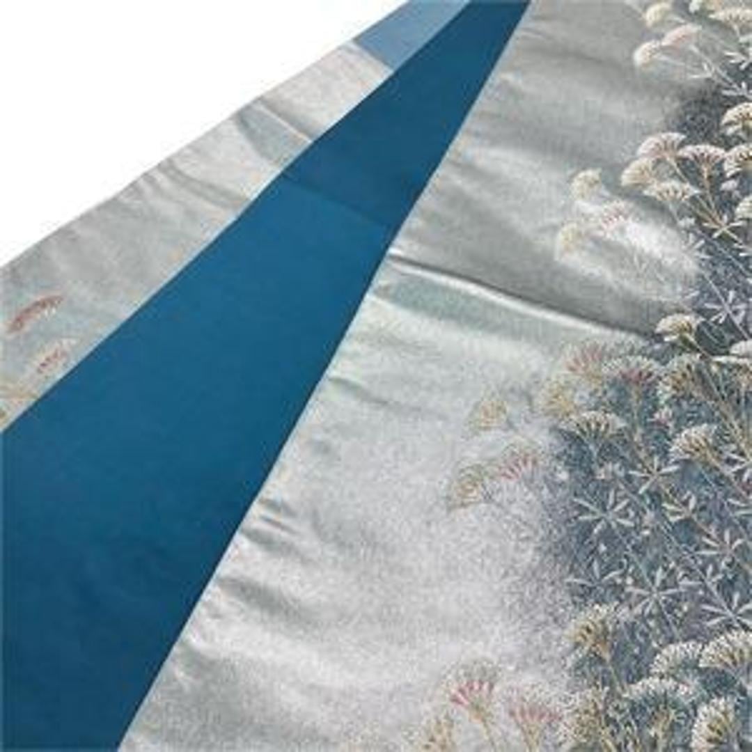 繻珍織、青銅箔、灰青色系のグラデーション、美しい色彩に花草模様がデザインされた素敵な柄裄のお品でございます。