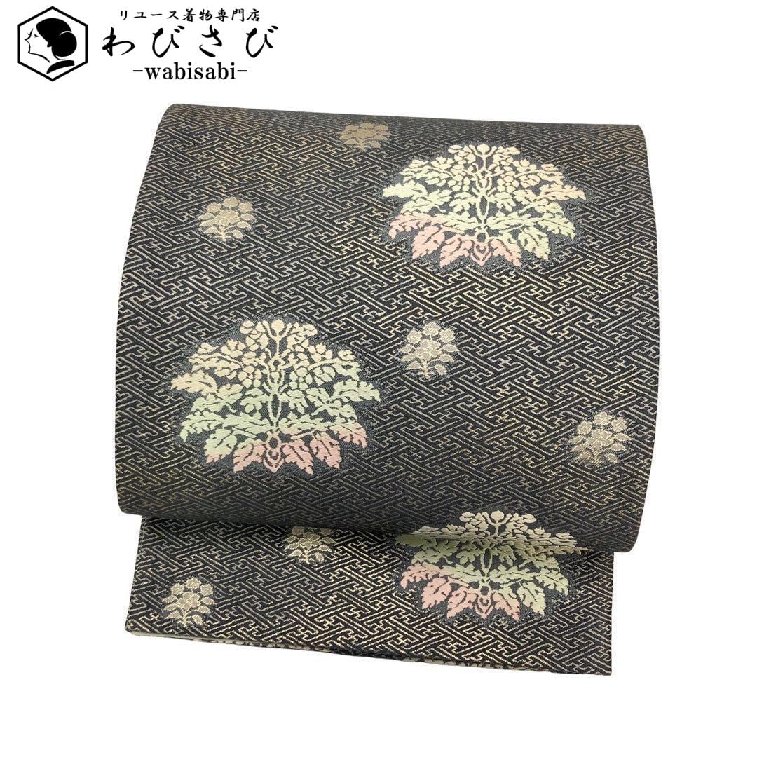 袋帯 天平唐花文錦文様 飛び柄花模様 紗綾形模様 金糸 墨色 O-3278 着物 きもの kimono 和服 和装 中古 リサイクル着物 【送料無料】
