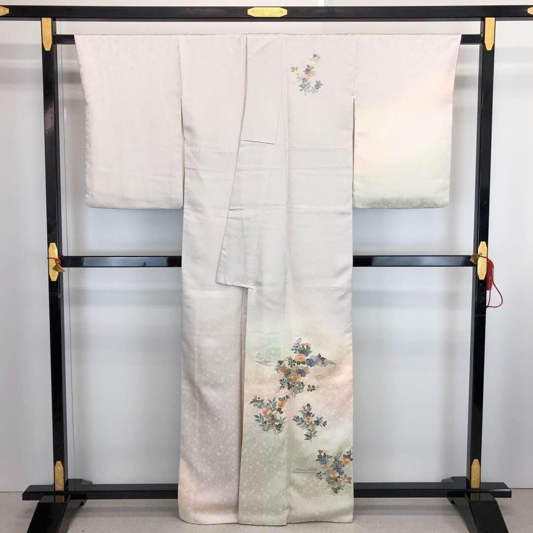 付下げ 刺繍柄 汕頭刺繍 扇に四季の花模様 金駒 暈し K-3429 着物 きもの kimono 和服 和装 中古 リサイクル着物 【送料無料】