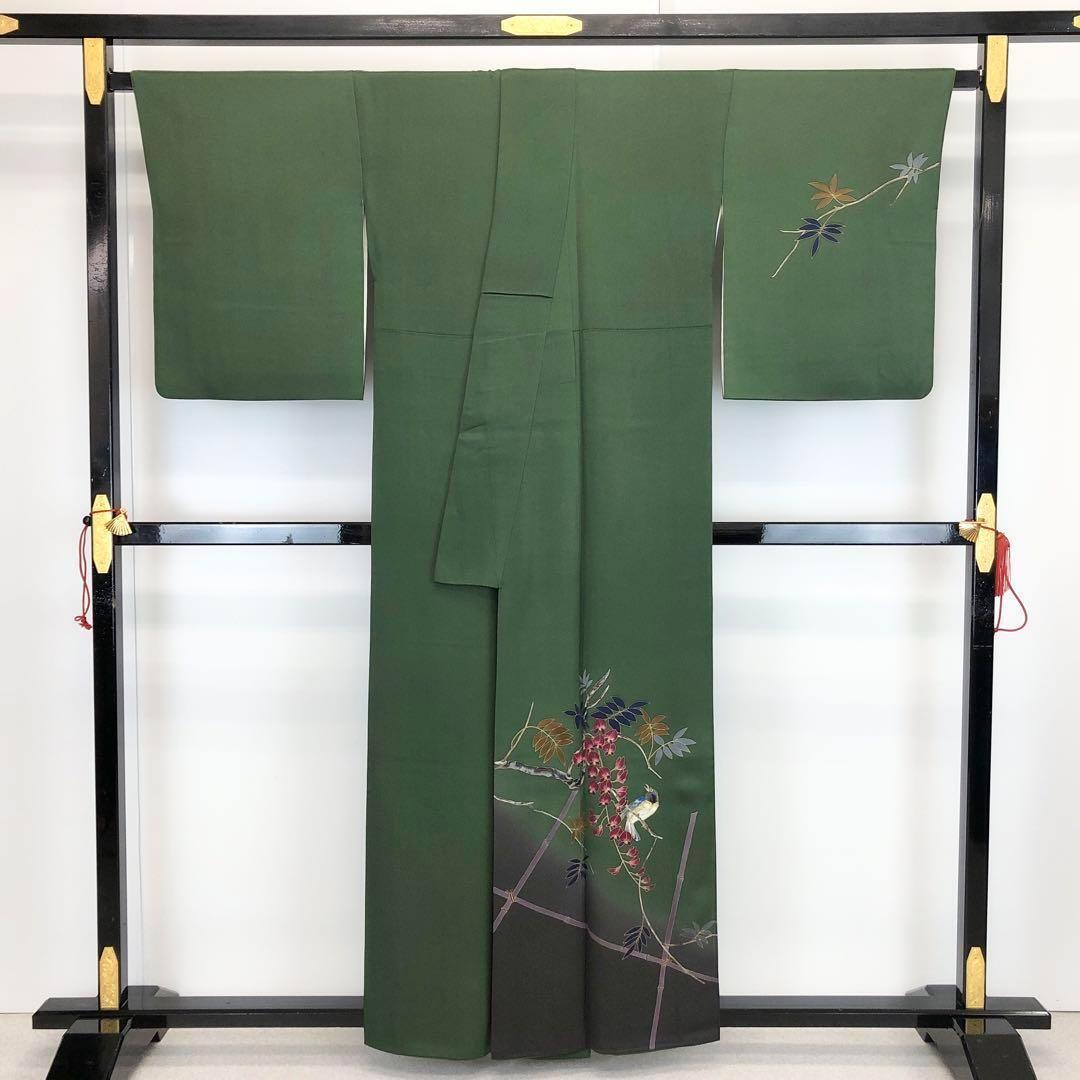 千歳緑色の深みのある緑味に暈し、一騎調の金彩を使った枝に鳥柄、美しい藤の花の柄裄がデザインされた素敵なお品でございます。