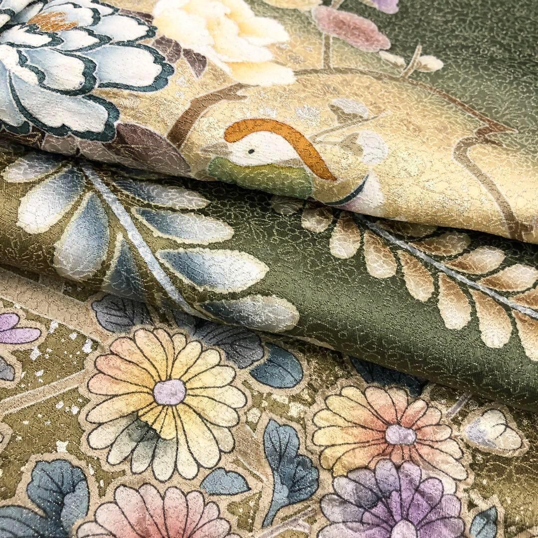 金通しに地模様の岩井茶色ベースのお色味に大変豪華な美しい四季の花柄絞り、暈しに鳥がデザインされた色彩の鮮やかな素敵な柄裄のお品でございます。