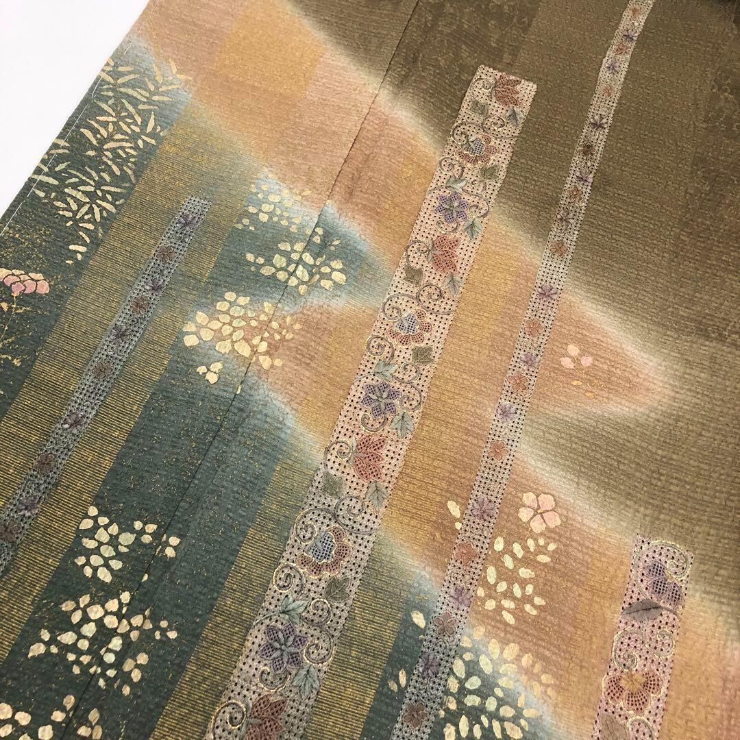 海松茶色の落ち着きのあるお色味に地模様、暈し、金彩、美しい花柄模様が汕頭刺繍などの総刺繍でデザインされた素敵な柄裄のお品でございます。