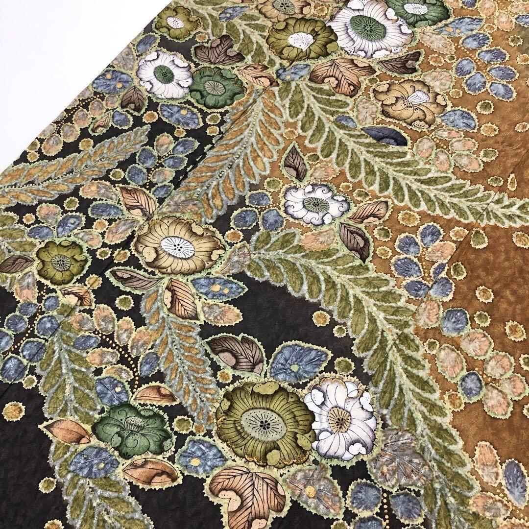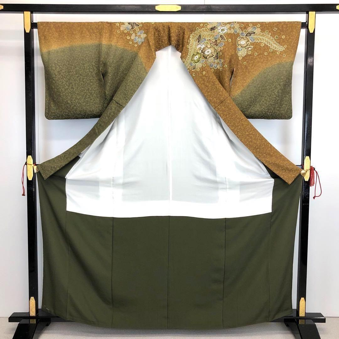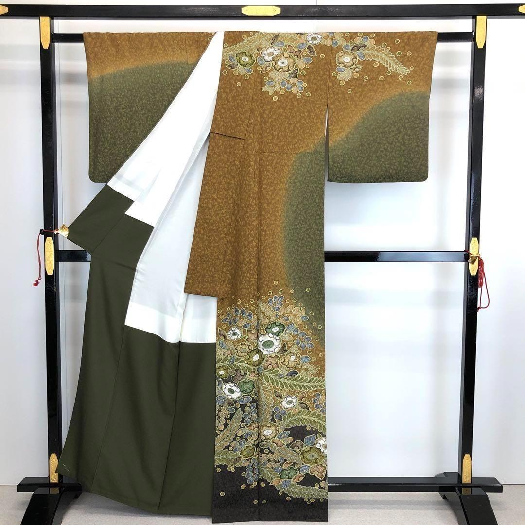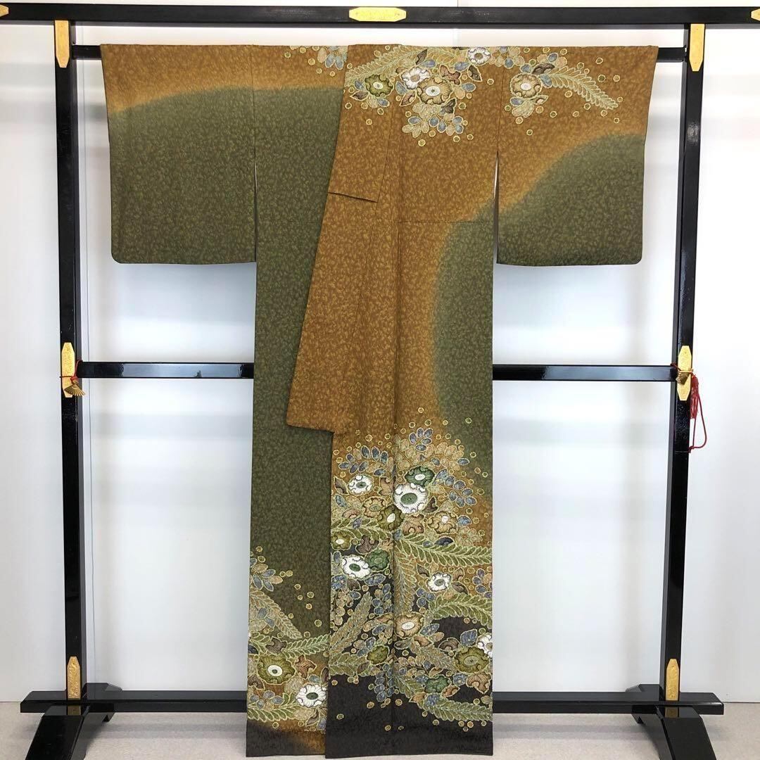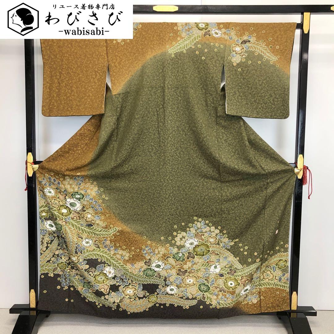 海松色ベースの2色の染色に美しい辻が花絞りの柄裄が大変華やかな印象の素敵な柄裄のお品でございます。