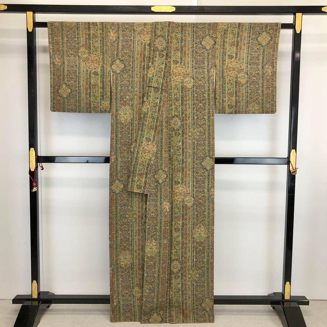 小紋 縦柄花鳥更紗模様 美しい色彩 ますいわ屋誂 海松色 縮緬 K-3464 着物 きもの kimono 和服 和装 中古 リサイクル着物 【送料無料】