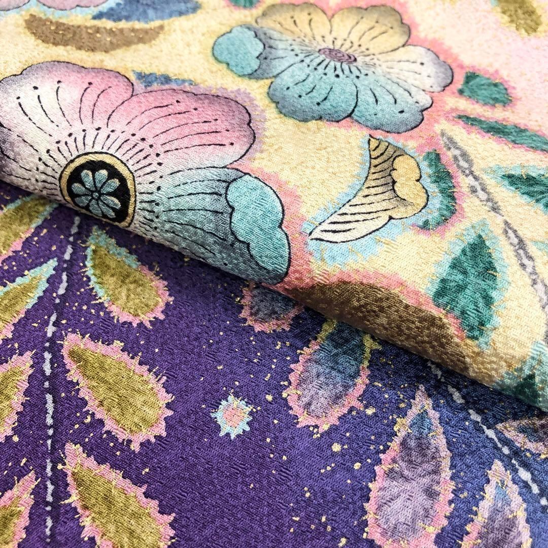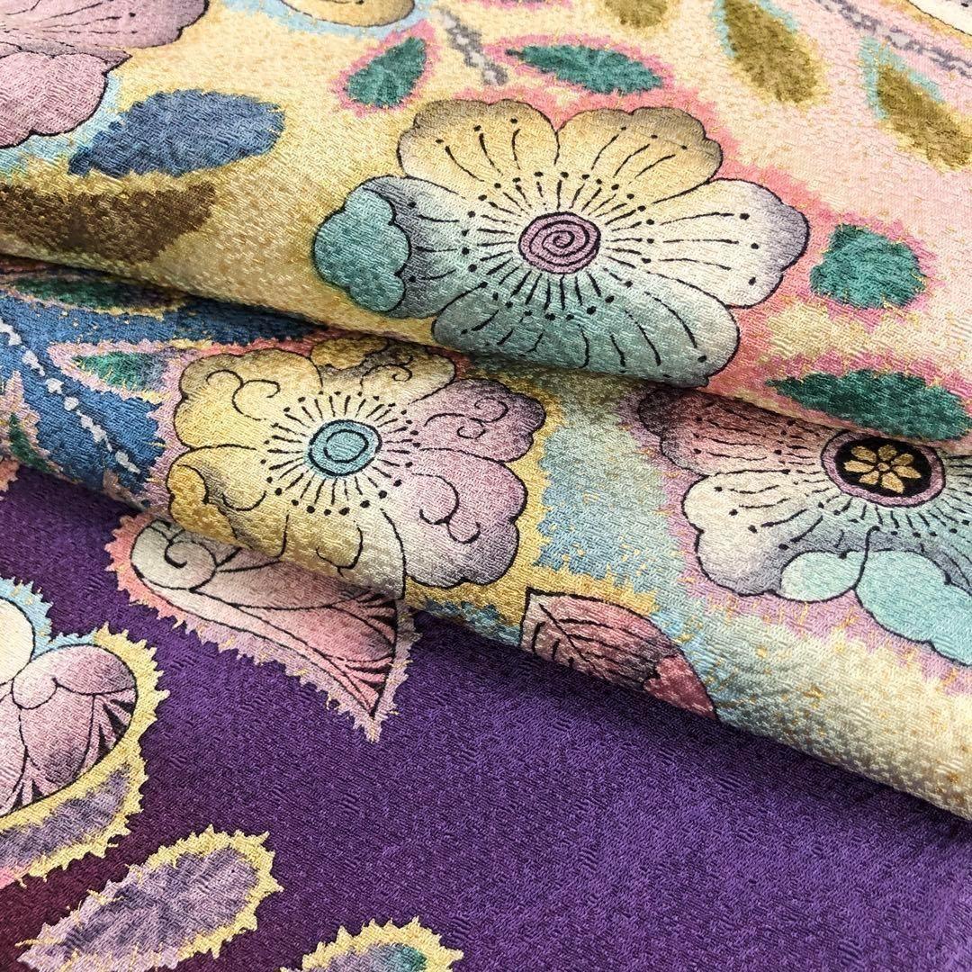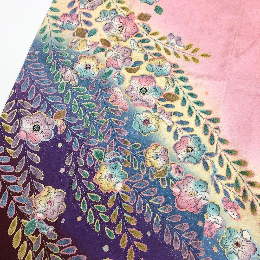 桜色の鮮やかなピンク色にグラデーション、美しい辻が花絞りがデザインされた大変華やかな柄行のお品でございます。