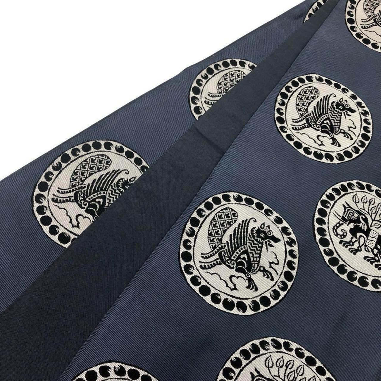 鉄葡萄色の落ち着きのあるお色味、丸の中に独特なデザインの抽象的な動物柄が目を惹く素敵な柄裄のお品でございます。