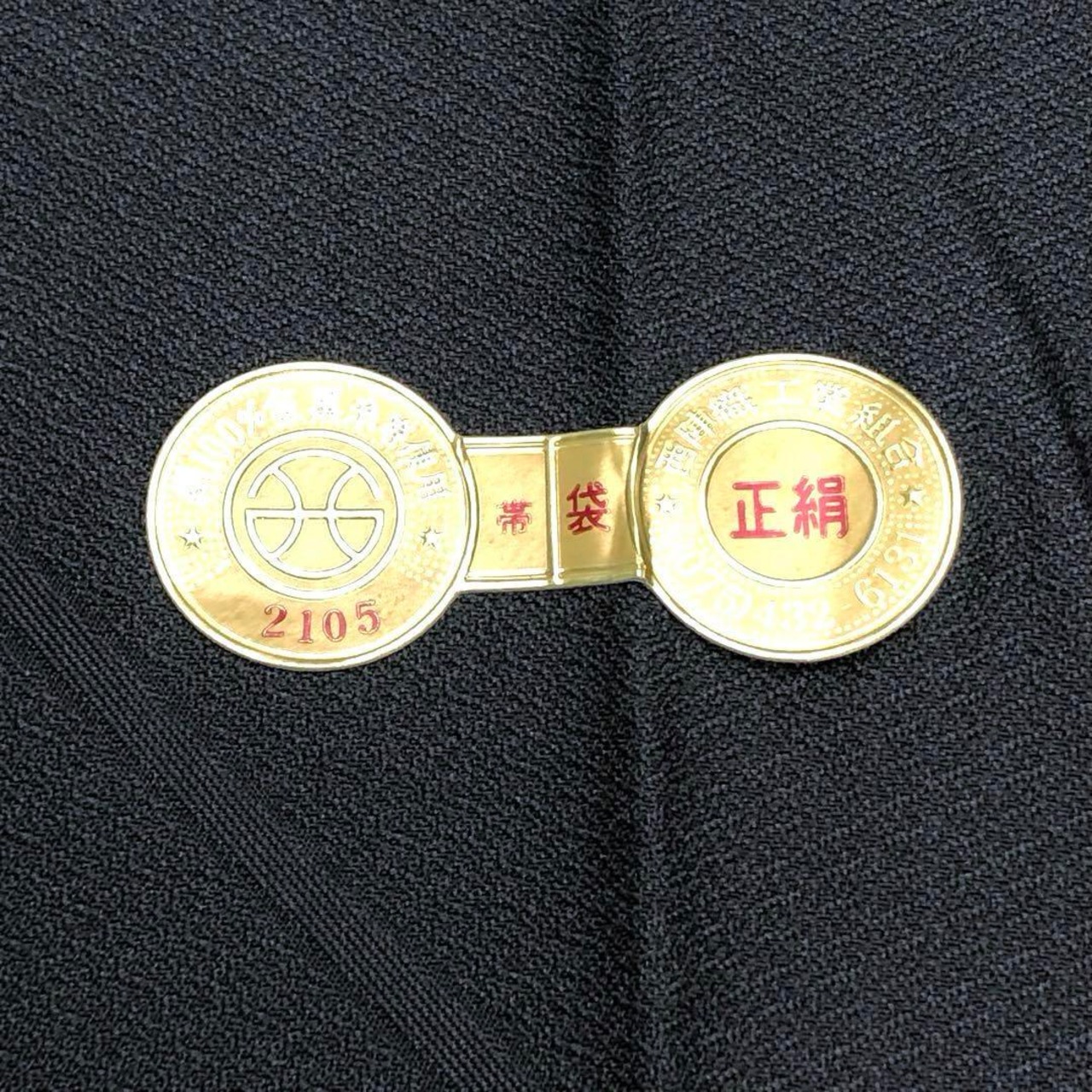 勝軍色の抹茶色系のお色味に赤、黄色の抽象模様がデザインされた素敵な柄裄のお品でございます。