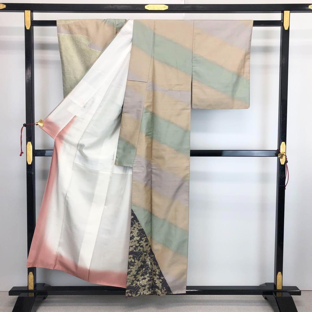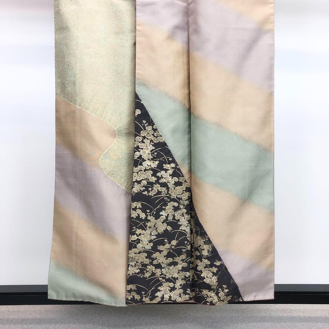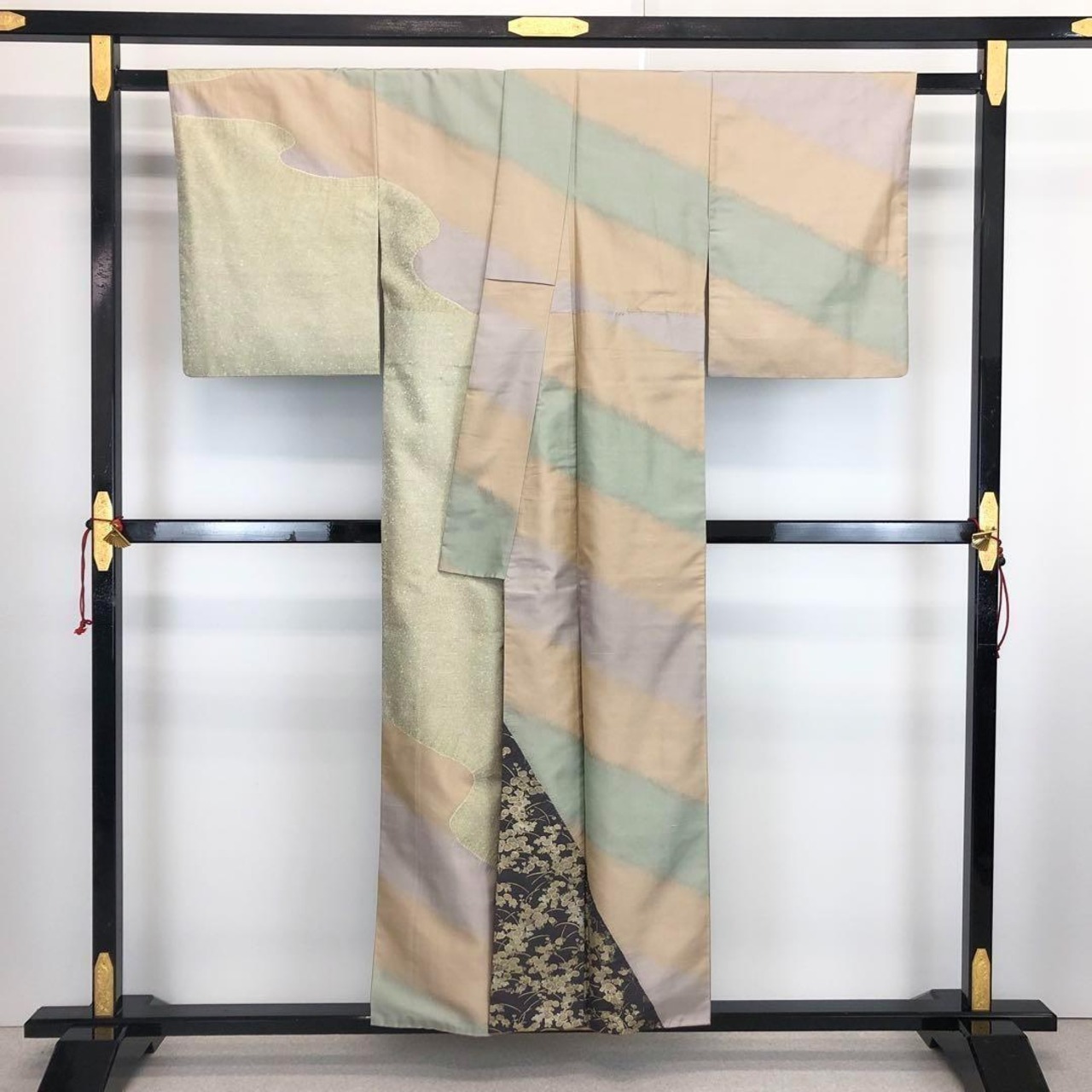 手触りの良い紬地にパステルカラーの色彩の染色、絞り、金彩を使った万寿菊の柄裄がデザインされた淡く鮮やかな色彩の美しい染色の素敵なお品でございます。