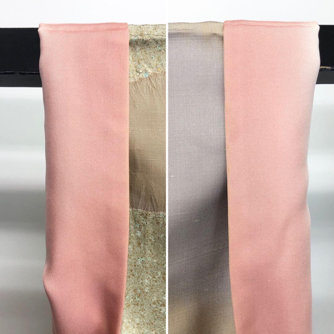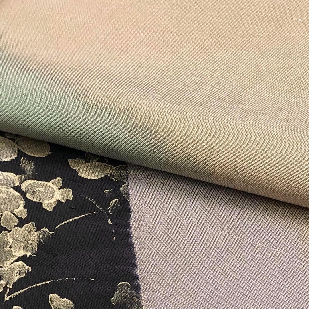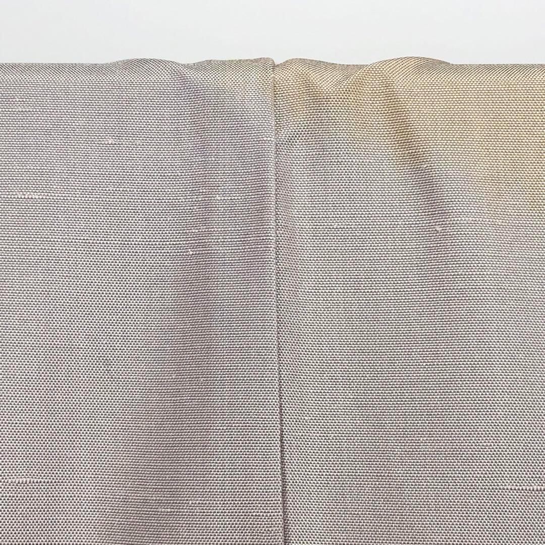 手触りの良い紬地にパステルカラーの色彩の染色、絞り、金彩を使った万寿菊の柄裄がデザインされた淡く鮮やかな色彩の美しい染色の素敵なお品でございます。