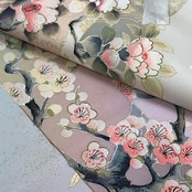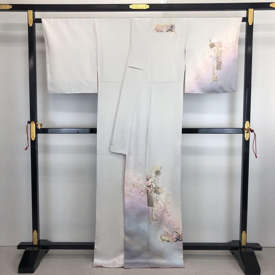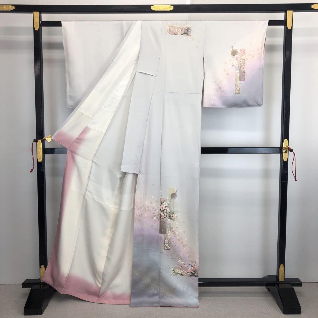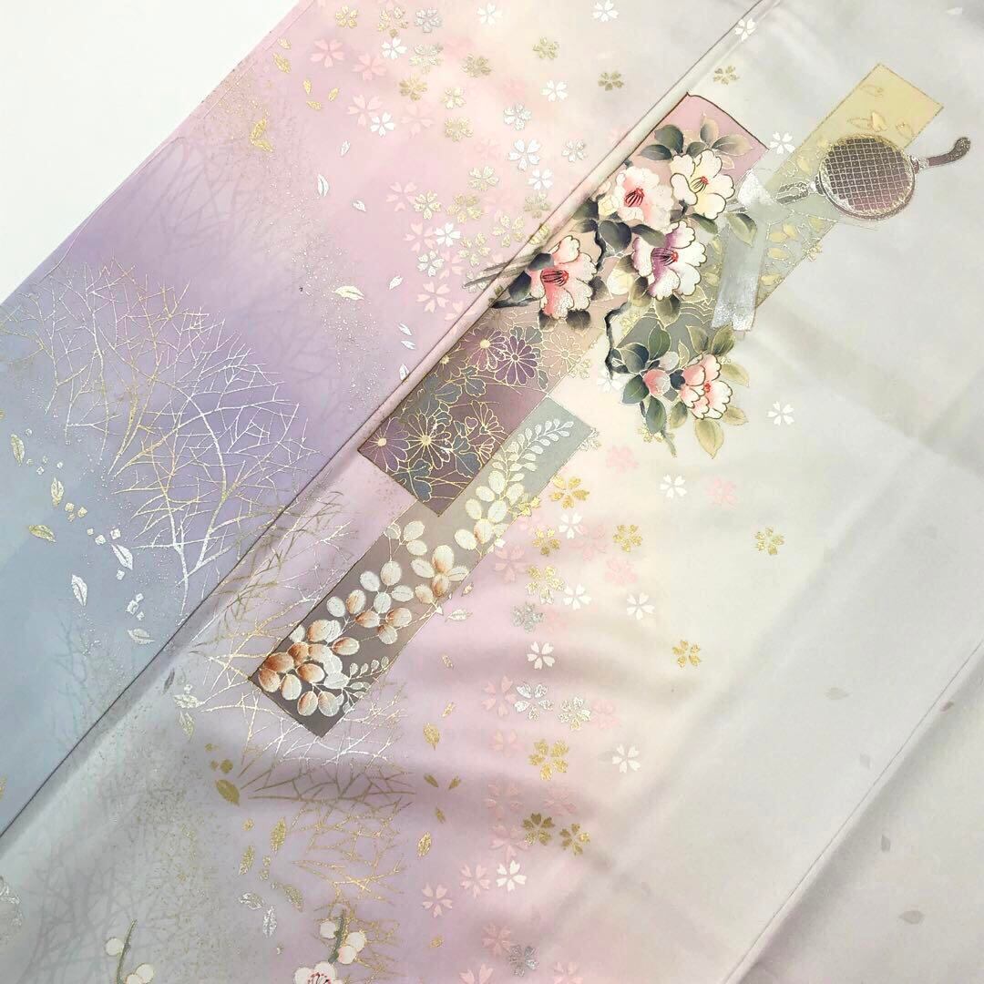 胡粉色の上品なお色味にグラデーション、金銀彩で煌びやかにデザインされた梅、椿、桜などの美しい花柄模様が素敵な柄裄のお品でございます。