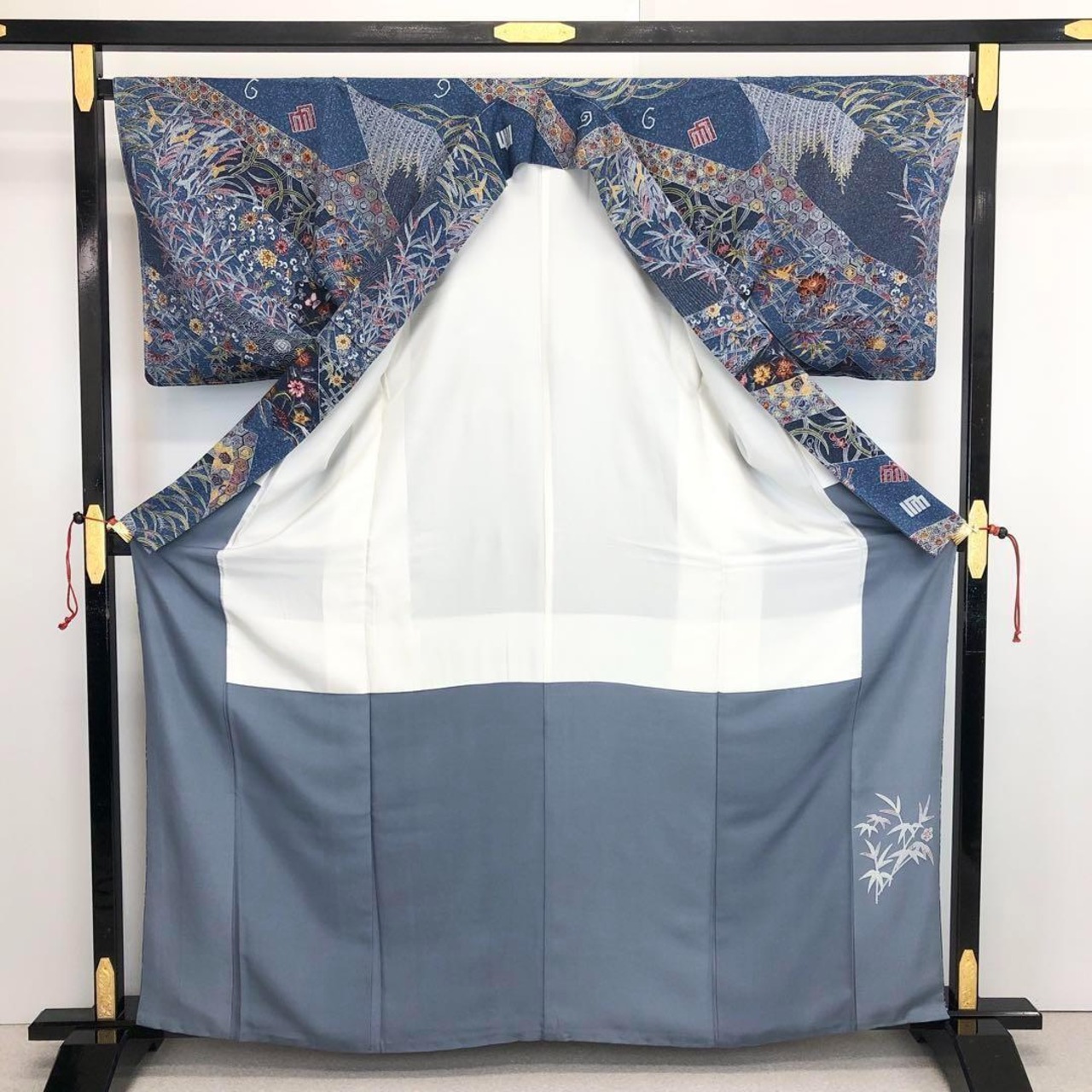 訪問着 美しい染柄 鮮やかな花模様 源氏香 叩き染 縮緬 青黛色 K-3489