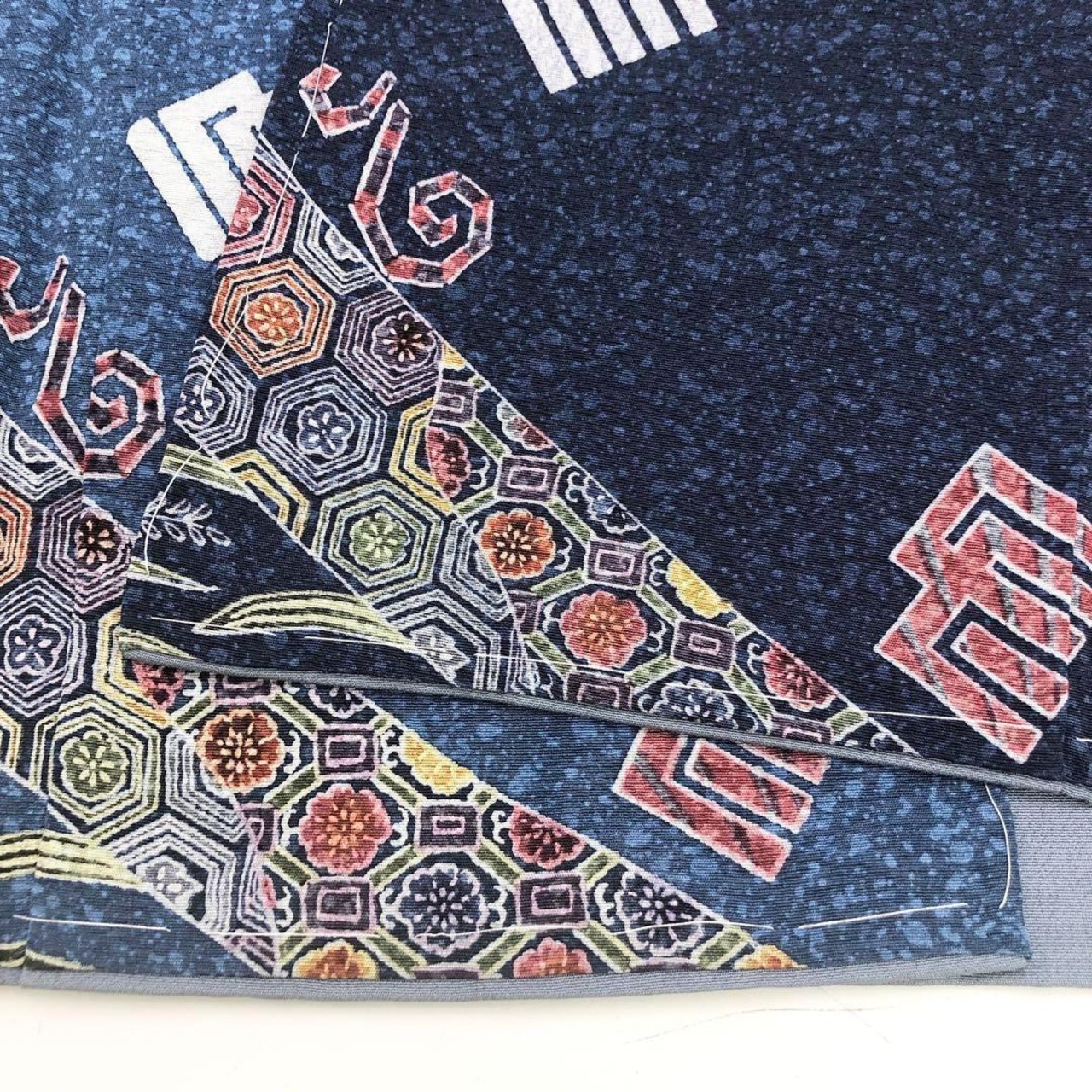 青黛色の縮緬に叩き染、斜めの寄せ柄、美しい染め色でデザインされた鮮やかな花模様、鳥、源氏香などの柄行が素敵なお品でございます。