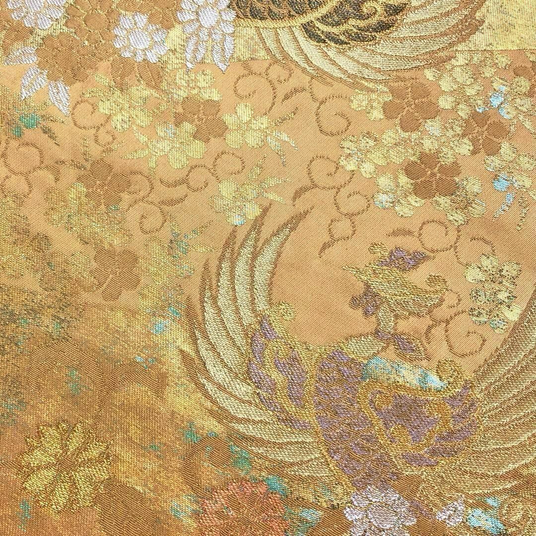 青銅金唐織と題された麦藁色ベースのお色味に引箔、美しい鳳凰に花唐草模様がデザインされた煌びやかで素敵な柄裄のお品でございます。