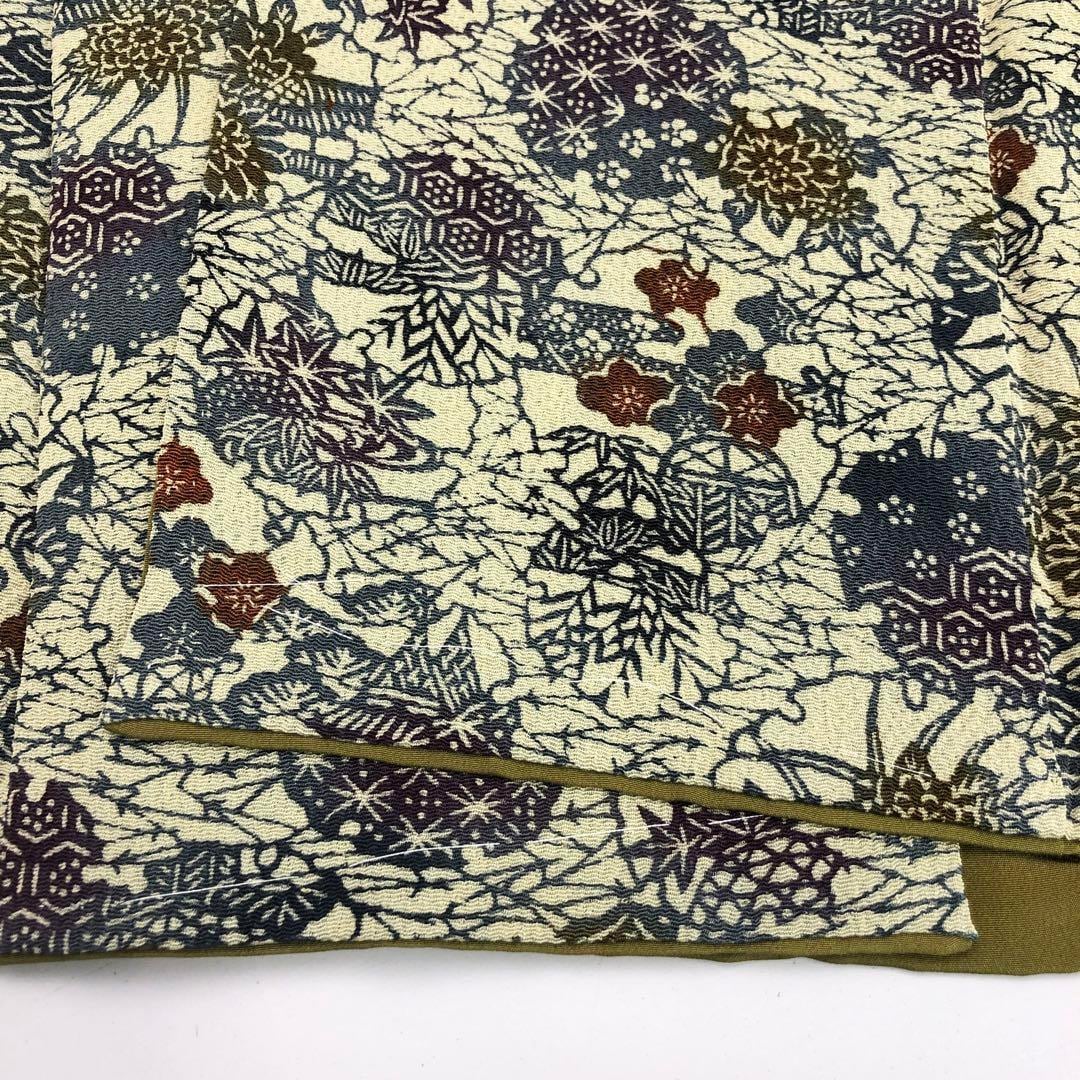 硫黄色の手触りの良い縮緬に雪輪に花模様の型染でデザインされた雰囲気の良い素敵なお品でございます。