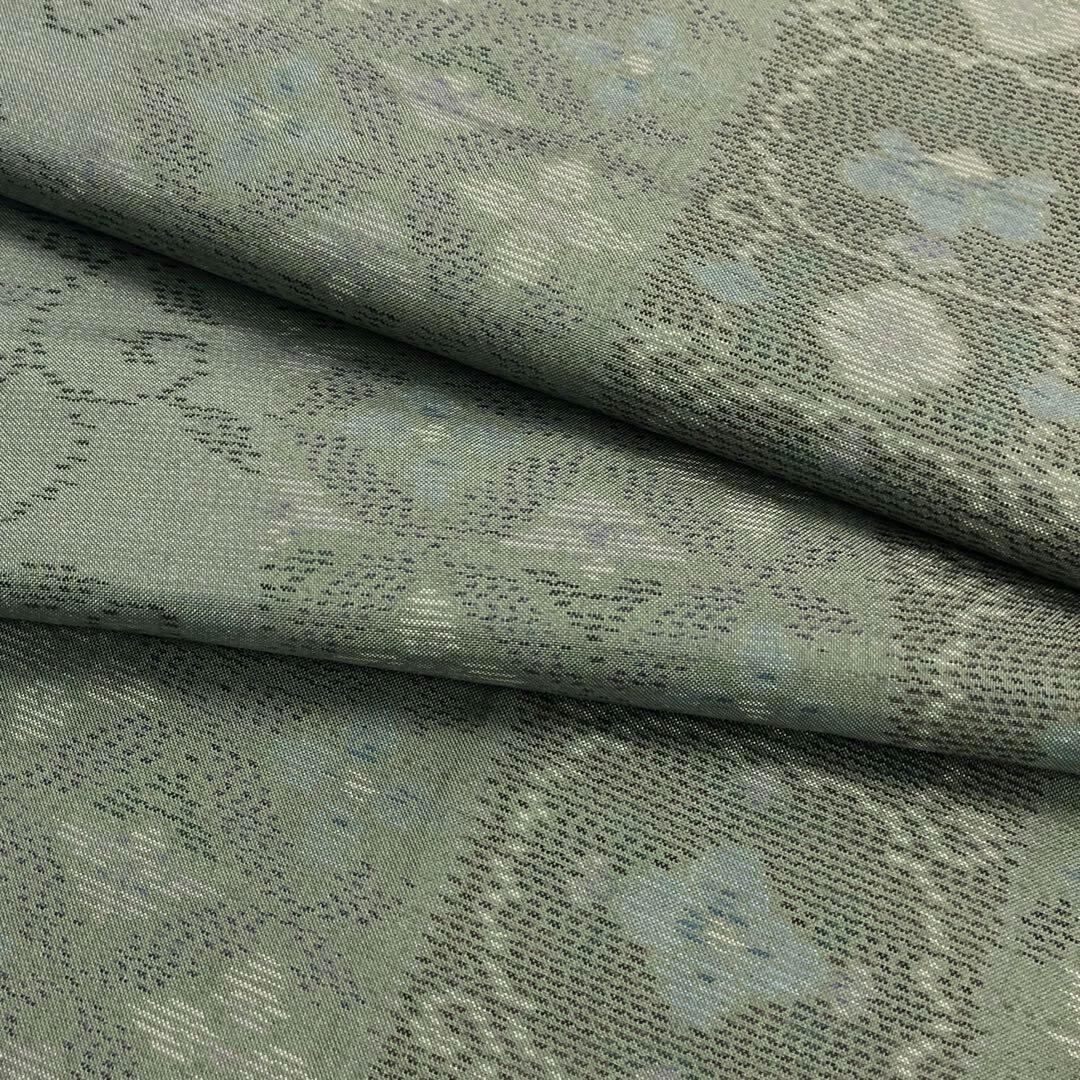 灰緑色のくすみ系の緑味のお色に縦柄の花唐草模様の柄裄がデザインされた素敵な柄裄のお品でございます。