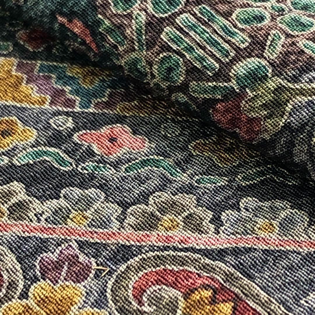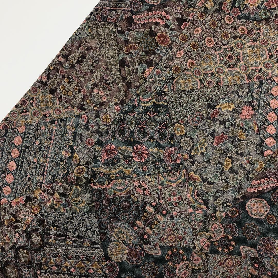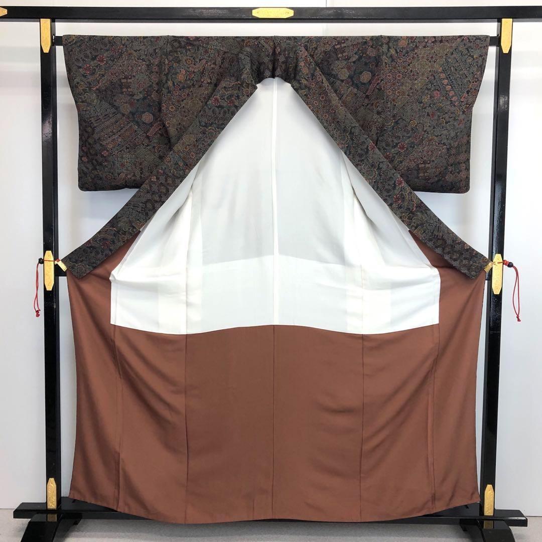溜色ベースの縮緬に落ち着きのある色彩の花更紗模様がデザインされた素敵な柄裄のお品でございます。