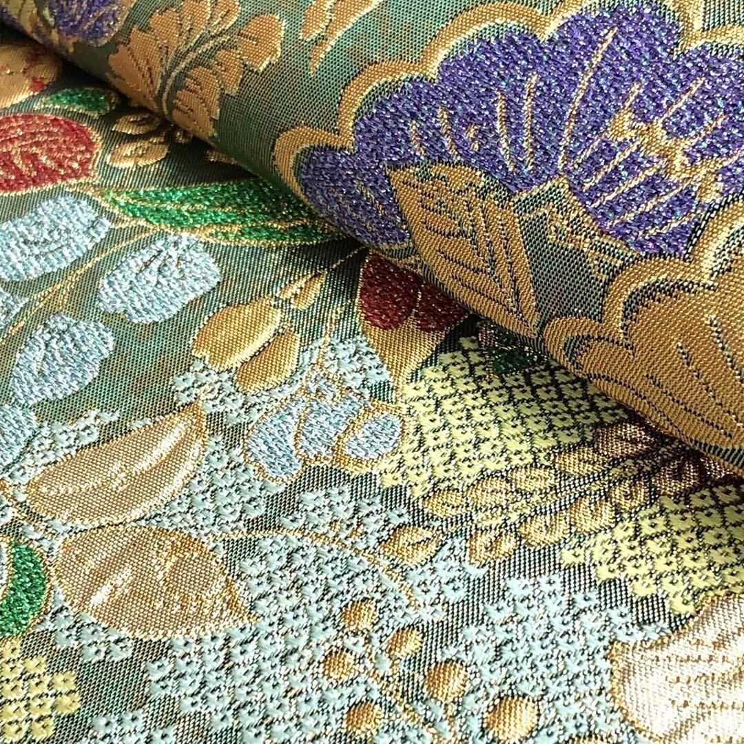 山葵色ベースの金糸の使われた煌びやかで鮮やかな色彩の辻が花模様がデザインされた素敵なお品でございます。