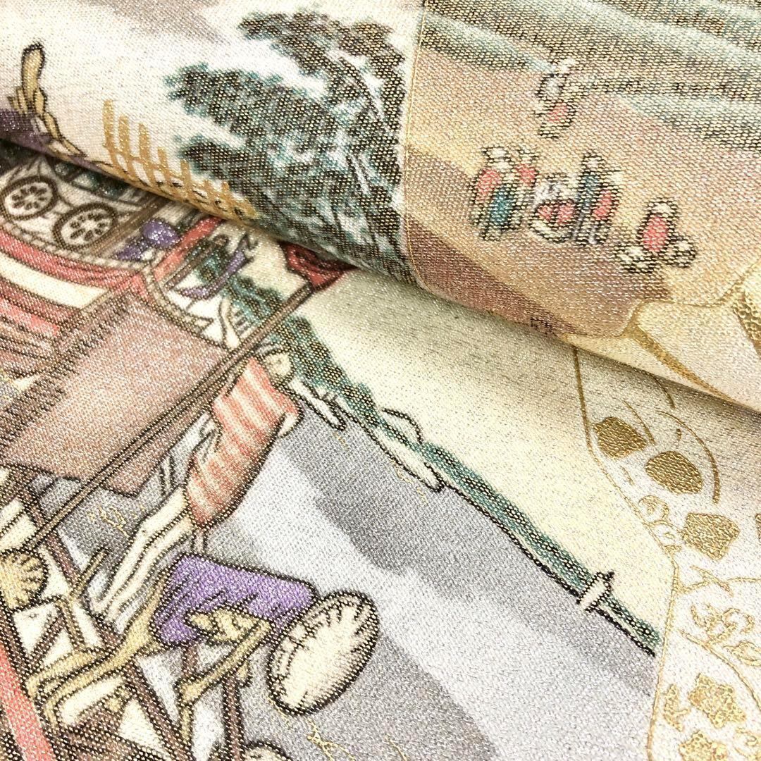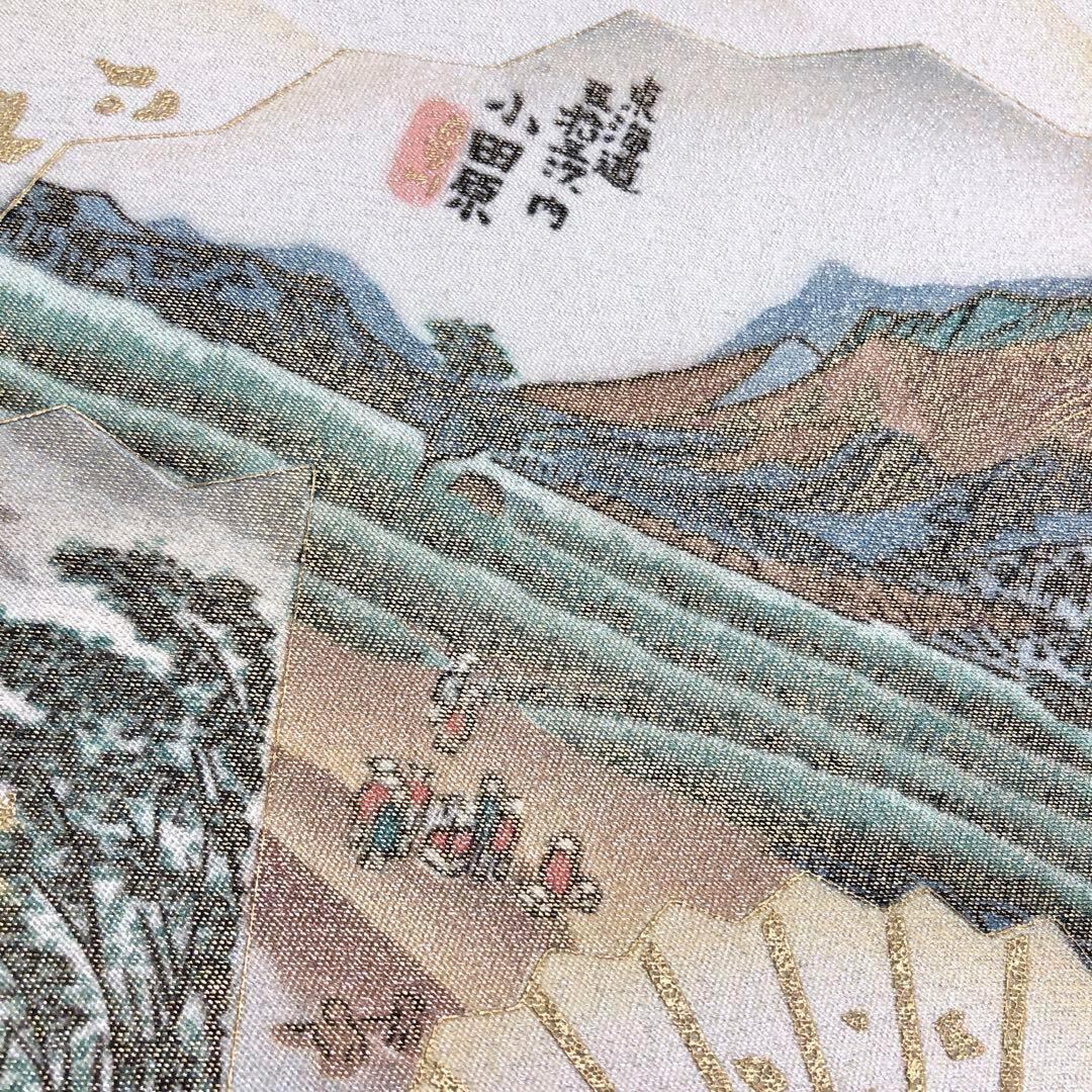 乳白色の品のある綴れ、東海道五拾三次の柄行がデザインされた素敵なお品でございます。
