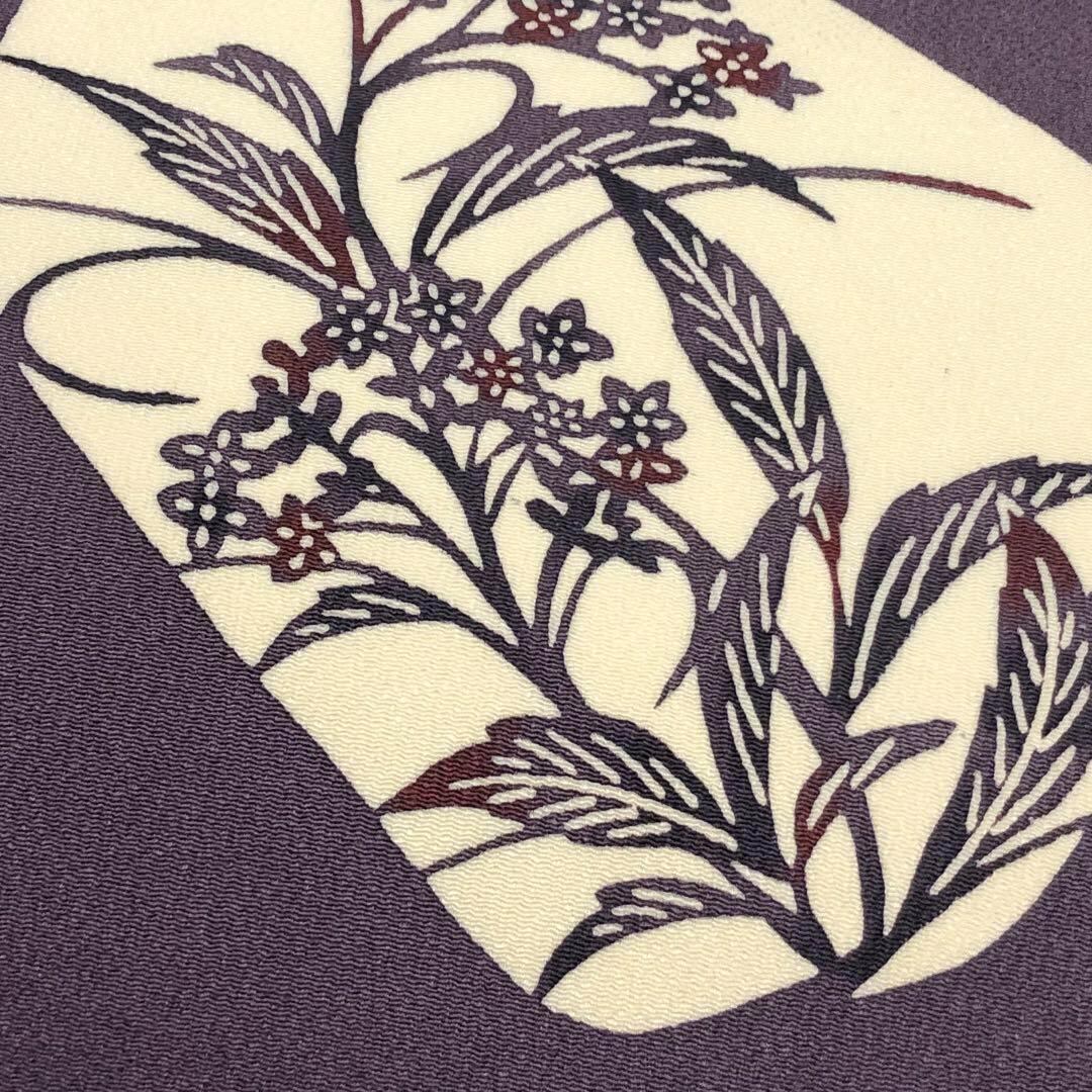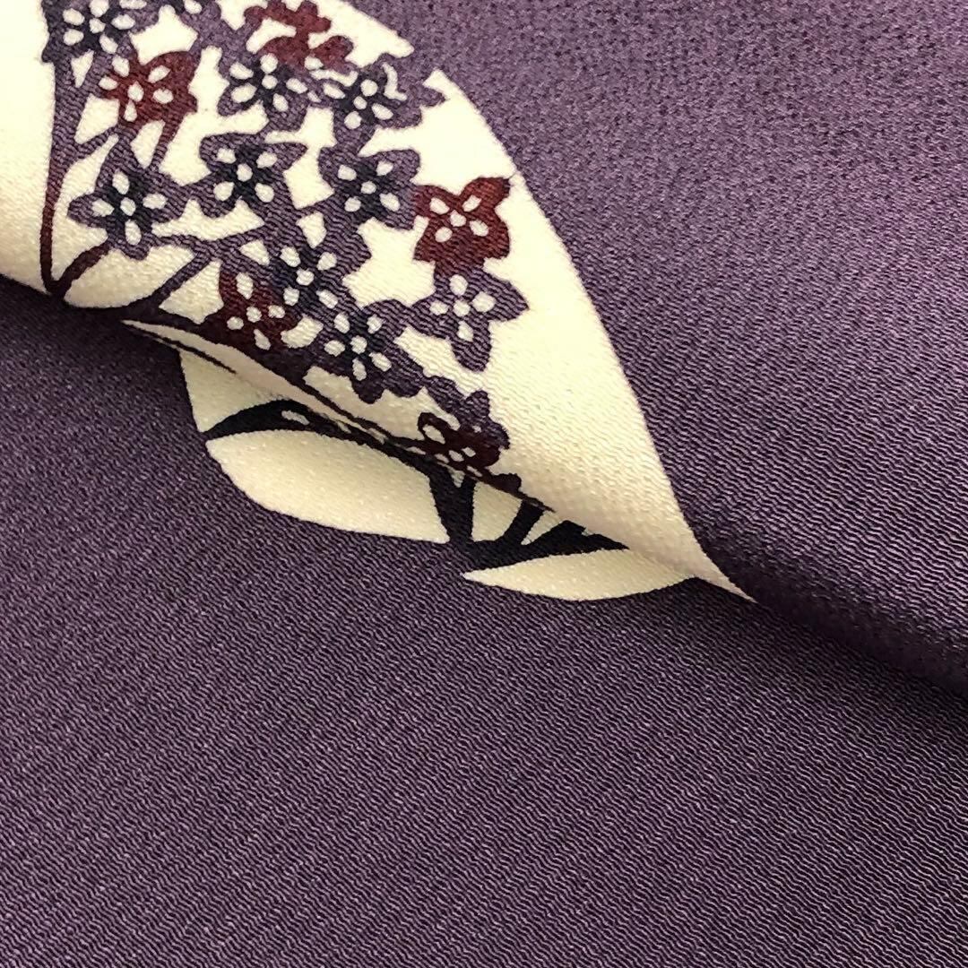 紫色の縮緬に品のある花柄模様が型染でデザインされた素敵な柄裄のお品でございます。
