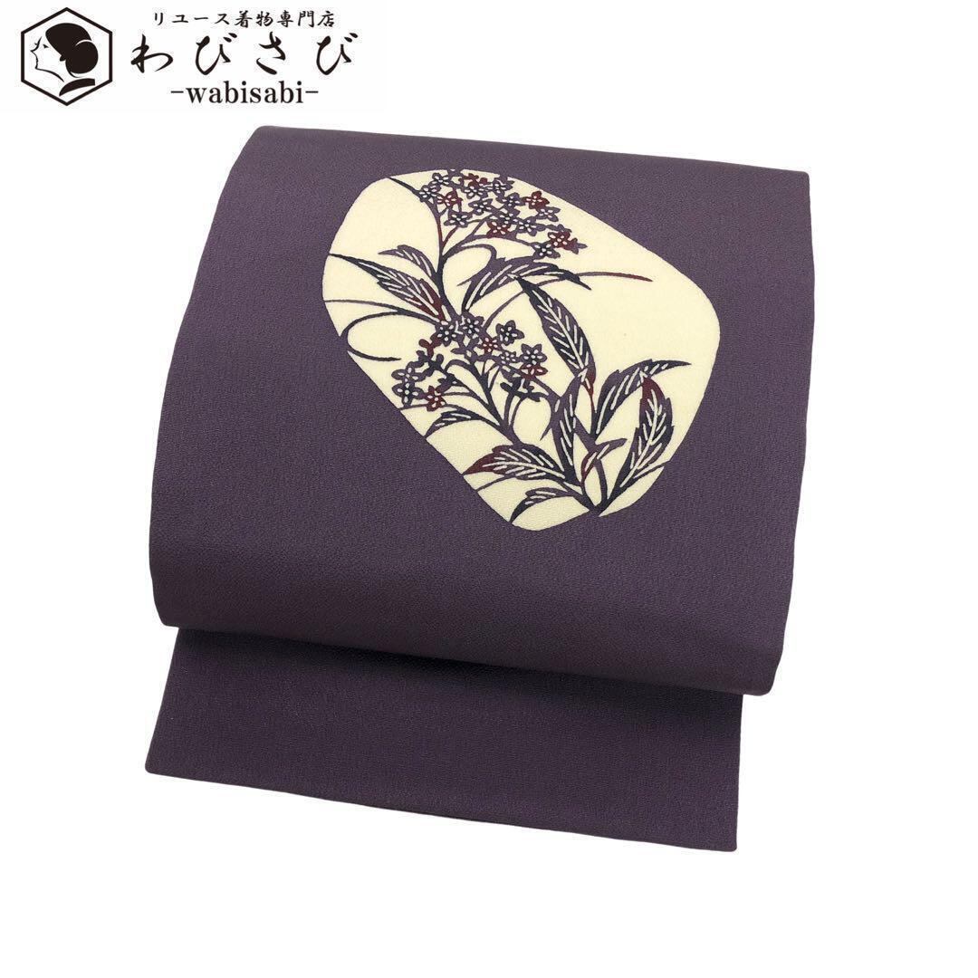 名古屋帯 作家物 型染 品のある花柄模様 縮緬 紫色 O-3377