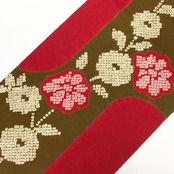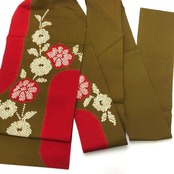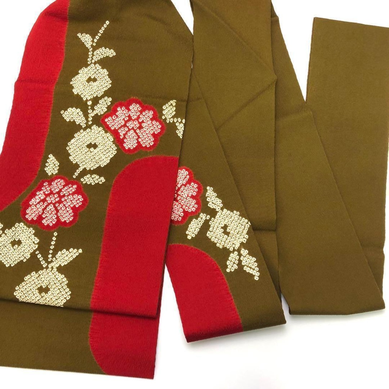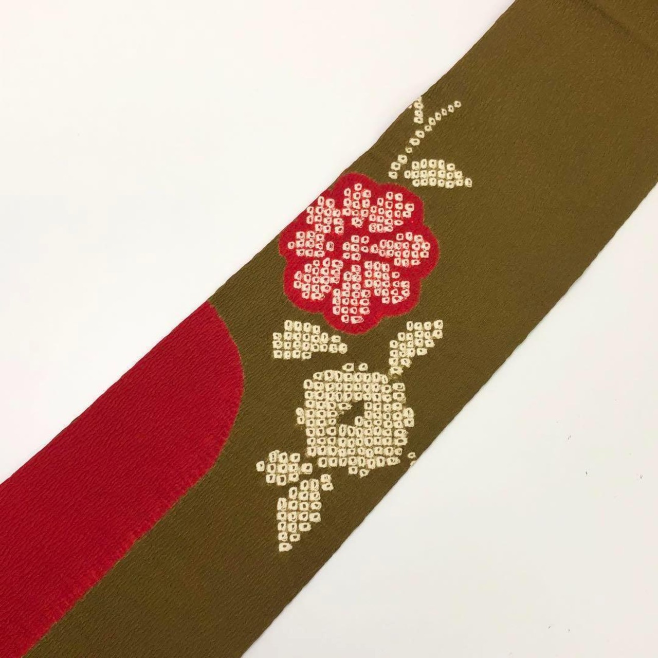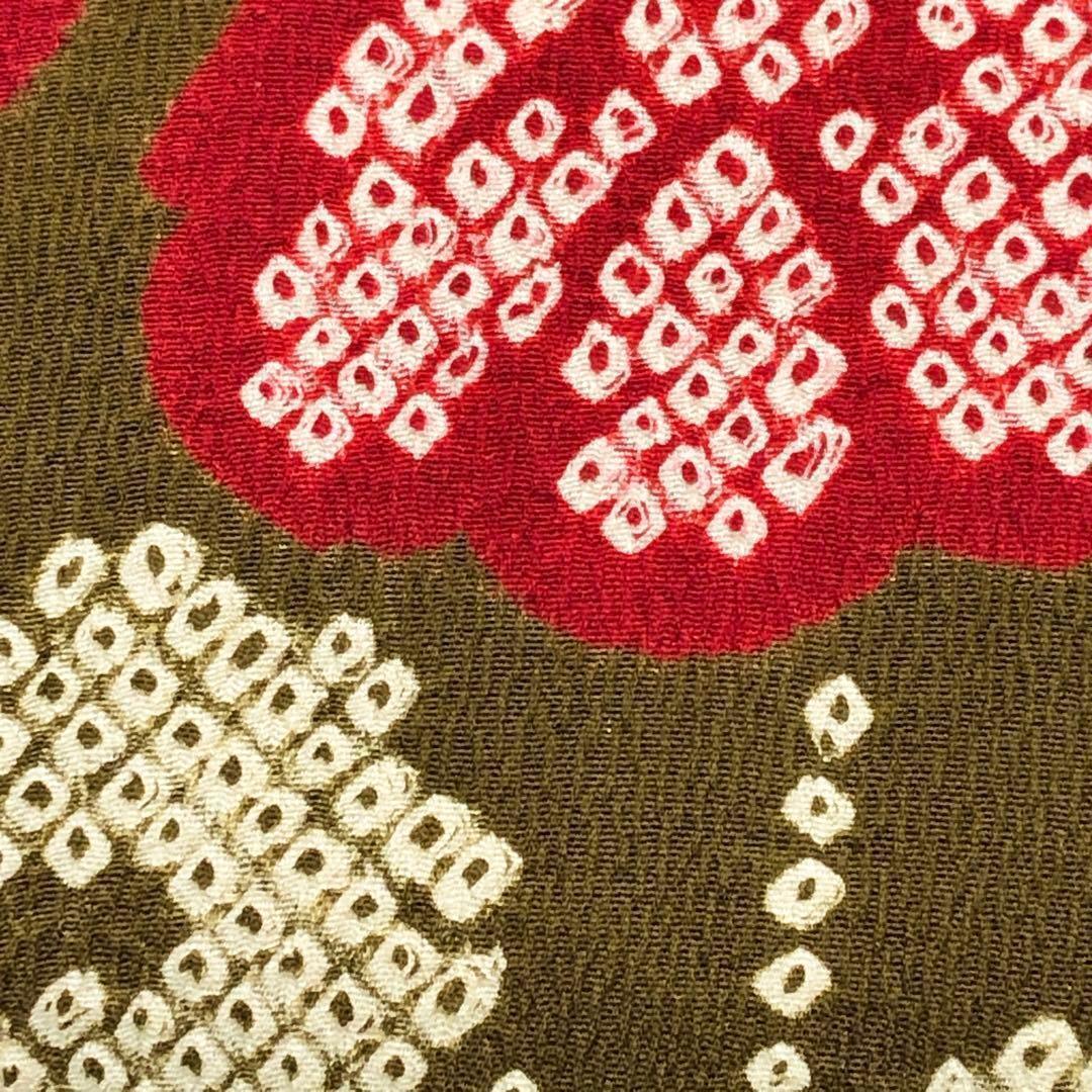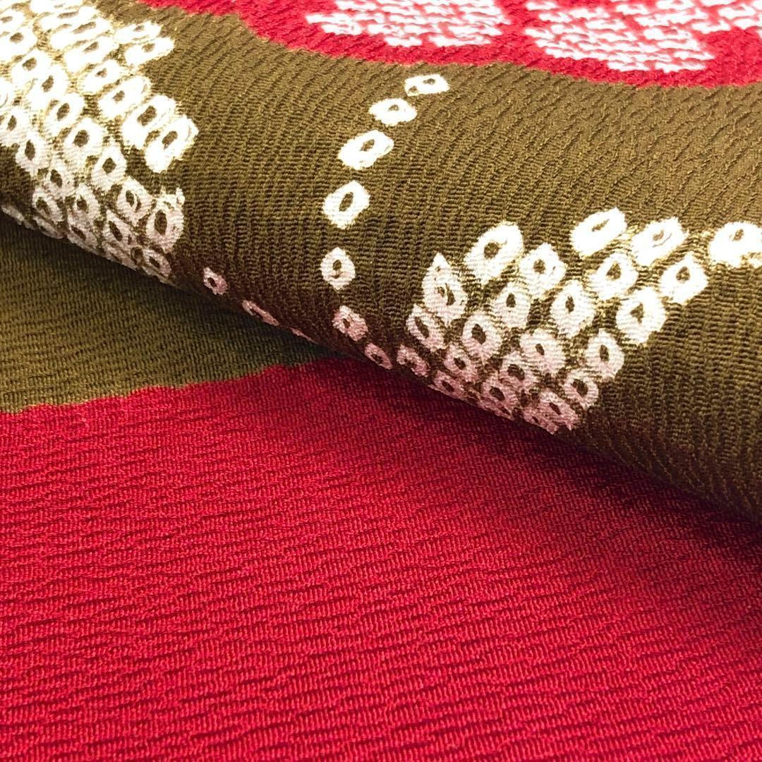 路考茶色と落ち着きのある赤色の2色の染めの縮緬に鹿の子に花柄模様の絞り柄でデザインされた素敵な柄裄のお品でございます。
