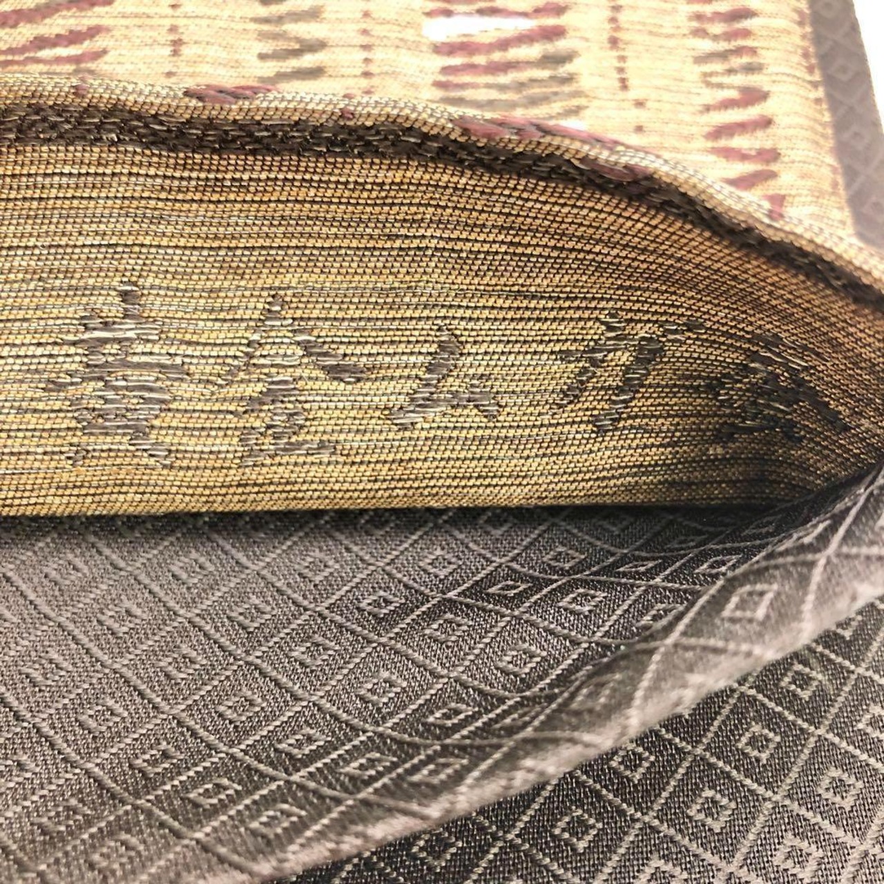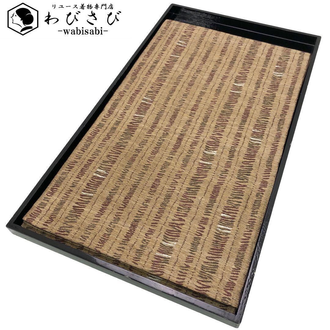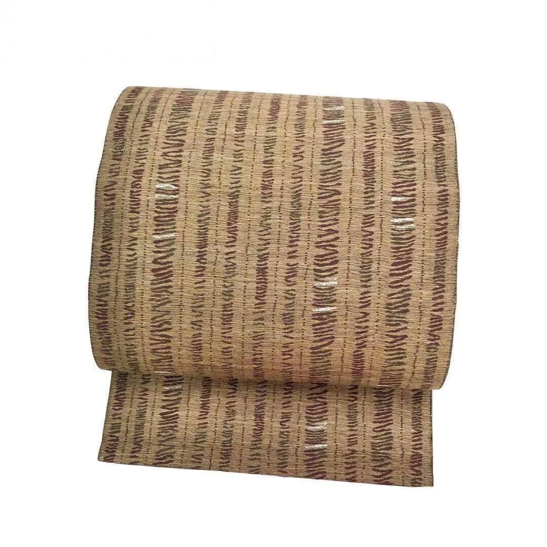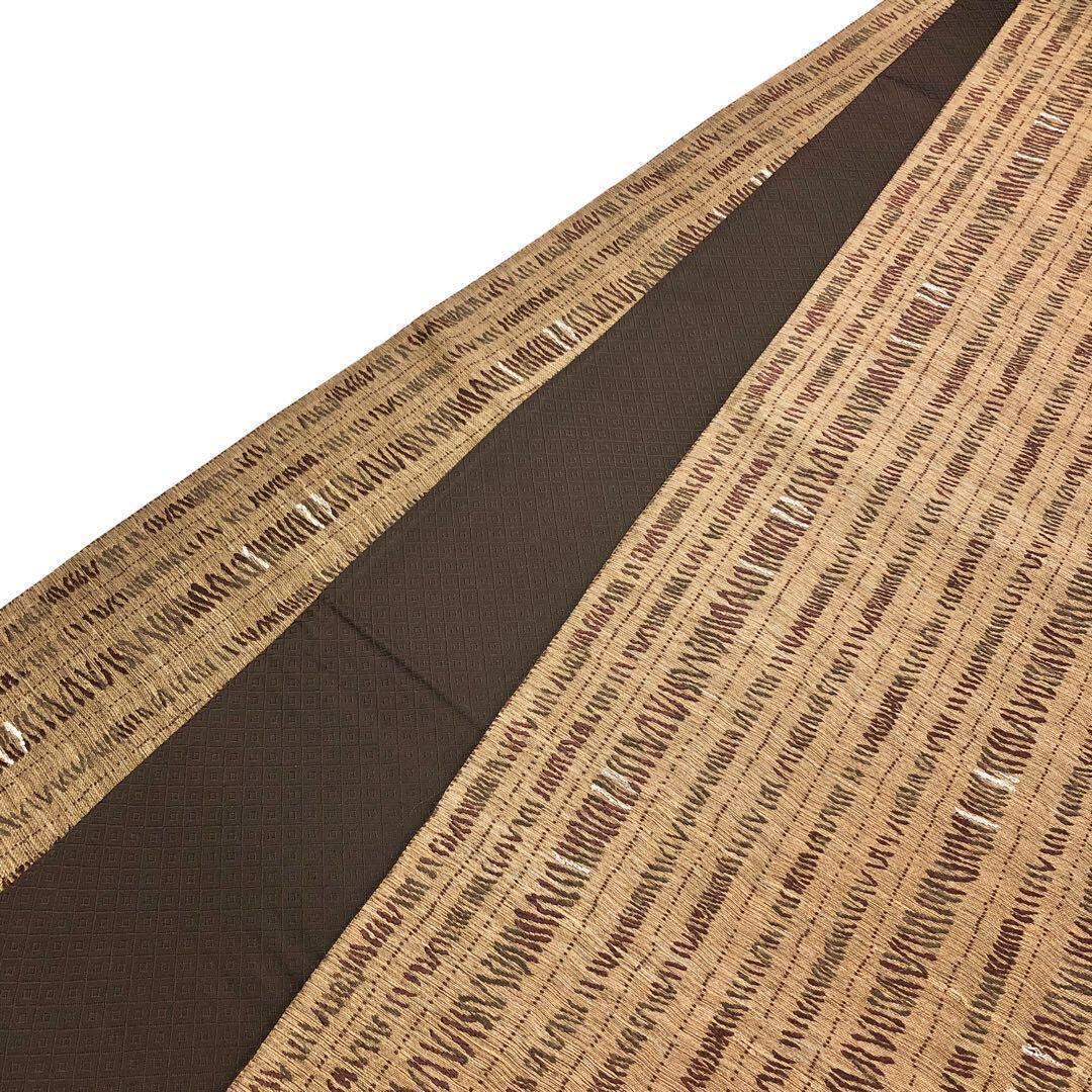 沈香茶色の自然な風合いのお色味に希少な黄金ムガ蚕を使った雰囲気の良い間道柄がデザインされた素敵な柄裄のお品でございます。