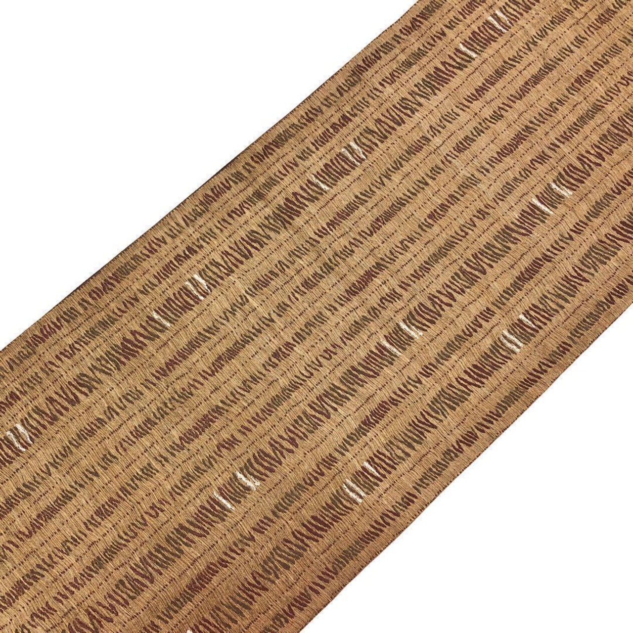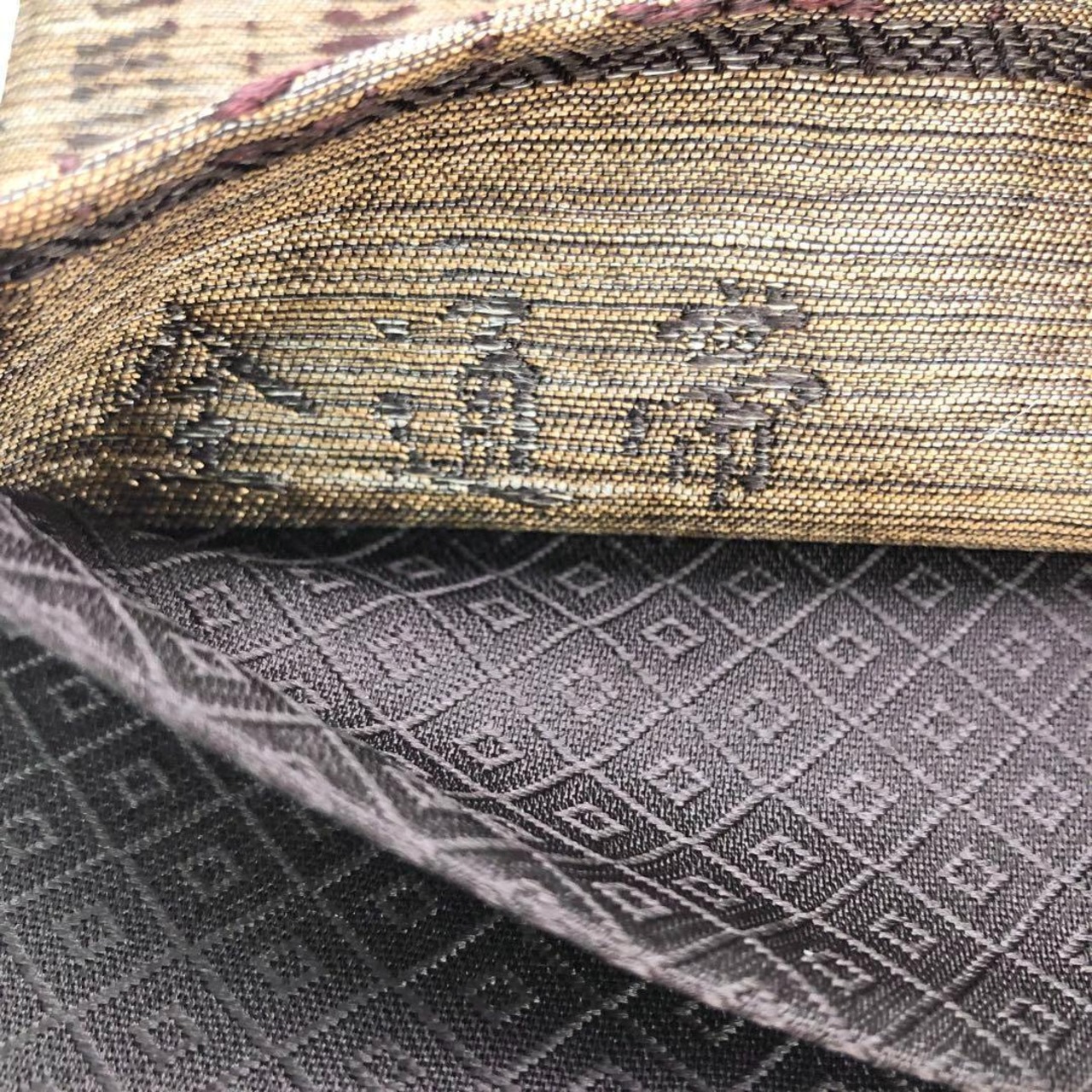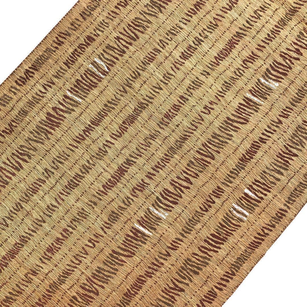 沈香茶色の自然な風合いのお色味に希少な黄金ムガ蚕を使った雰囲気の良い間道柄がデザインされた素敵な柄裄のお品でございます。