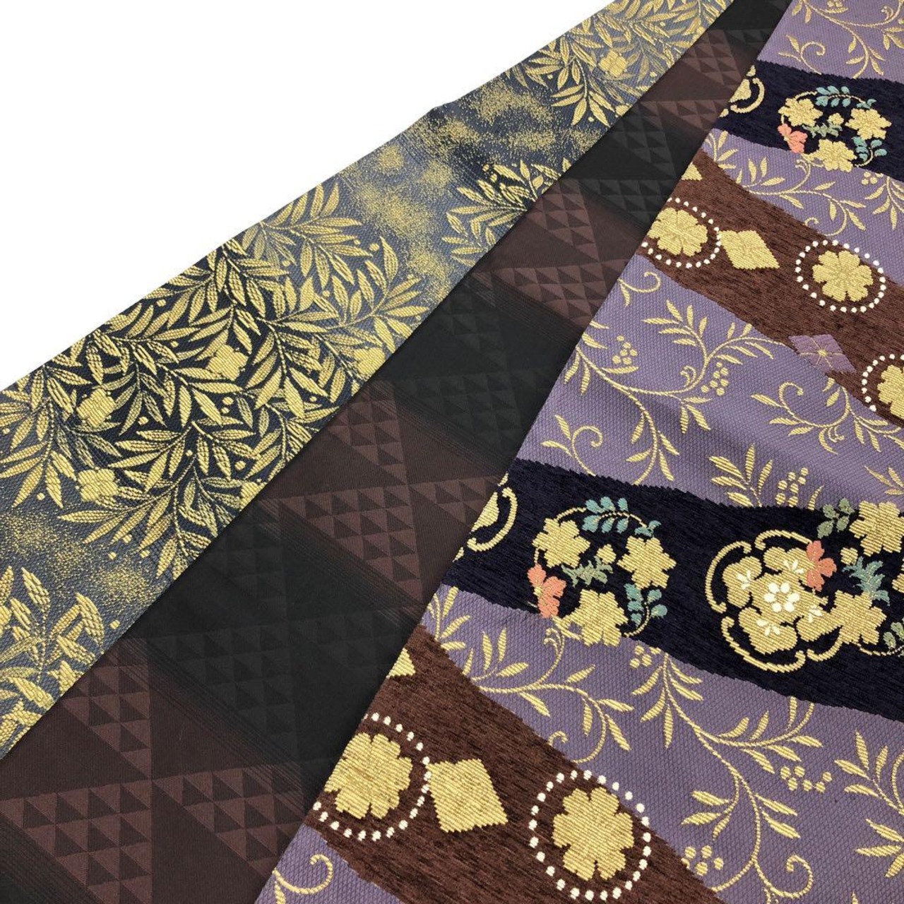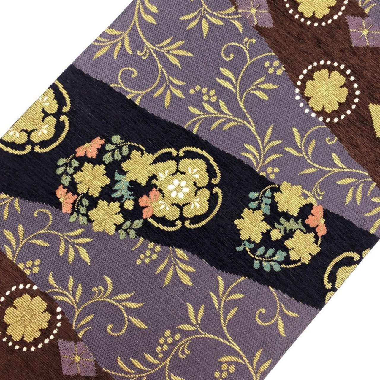 金華山織双図全通と題された紫苑色ベースの金華山織の花唐草模様の柄行など四面それぞれの柄裄が楽しめるに素敵なお品でございます。