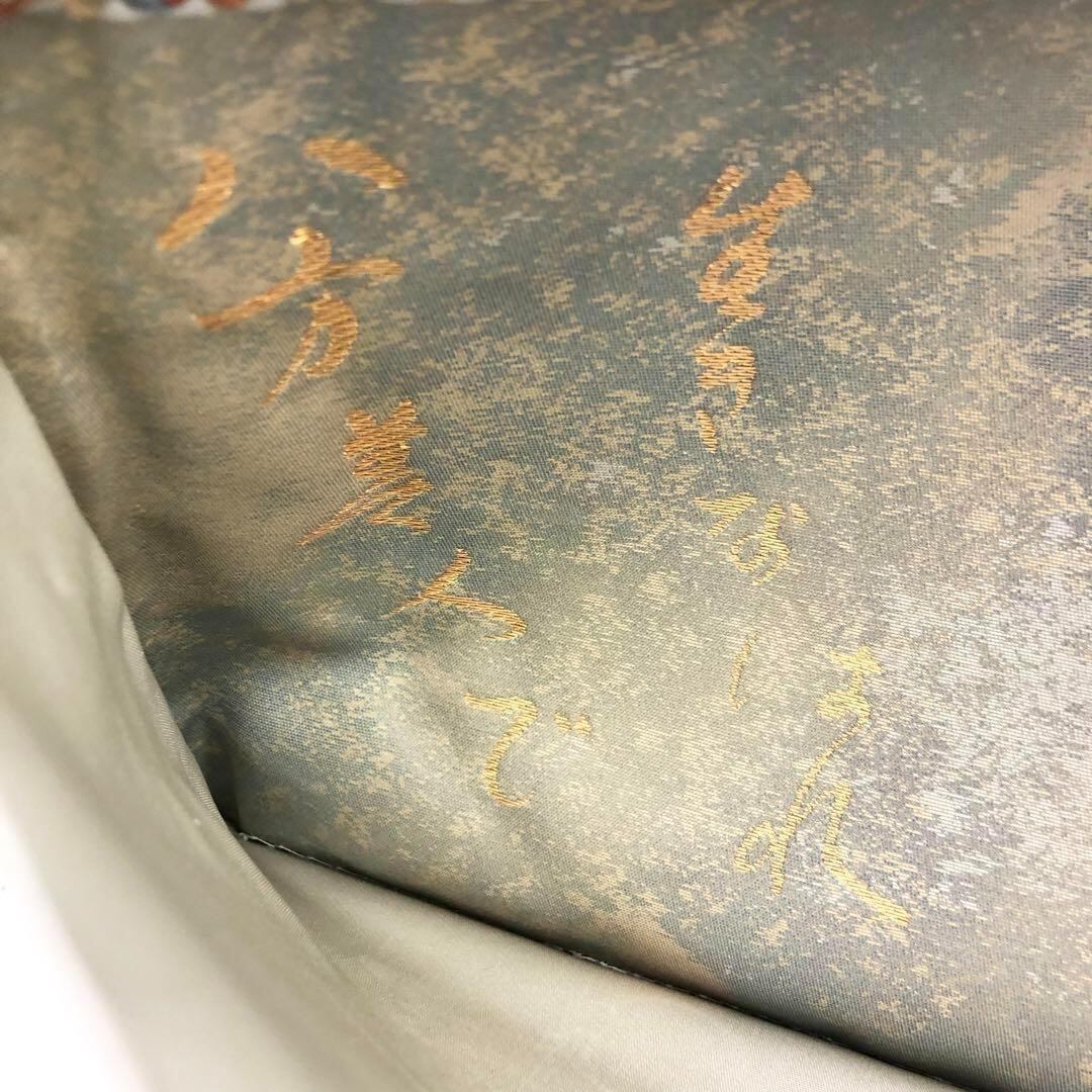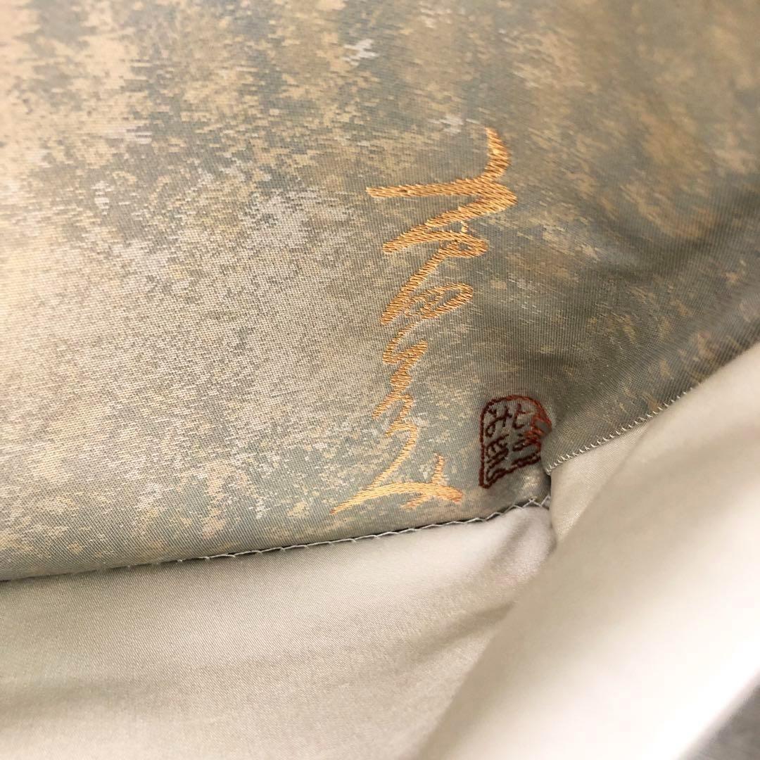 白銅色の品のあるお色味にたれ先には「八方美人で生きなはれ」、金銀糸を使った美しい花模様に鳥柄がデザインされた煌びやかで上品な柄裄が素敵なお品でございます。