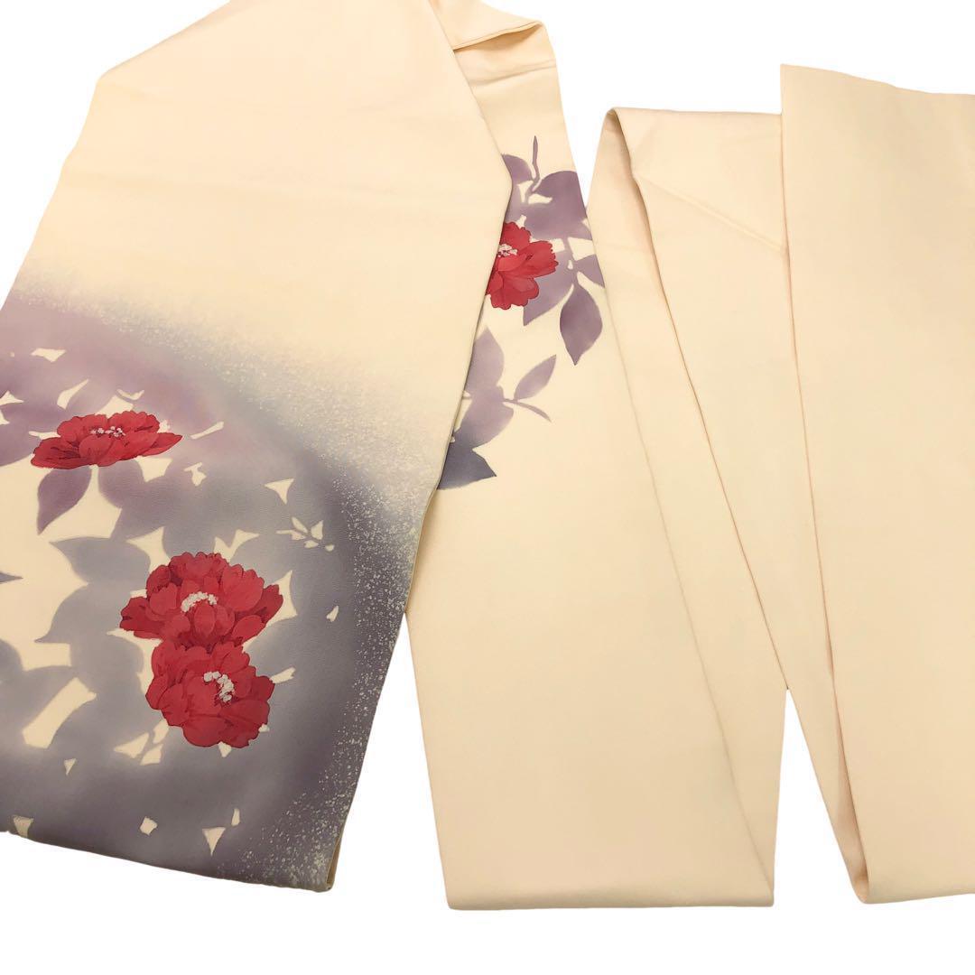 麹色の品のあるお色味の塩瀬に手描きで描かれた赤い花柄、葉のシルエット模様がデザインされた素敵な柄裄のお品でございます。