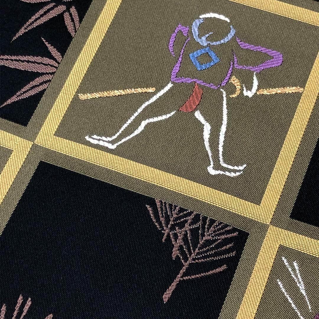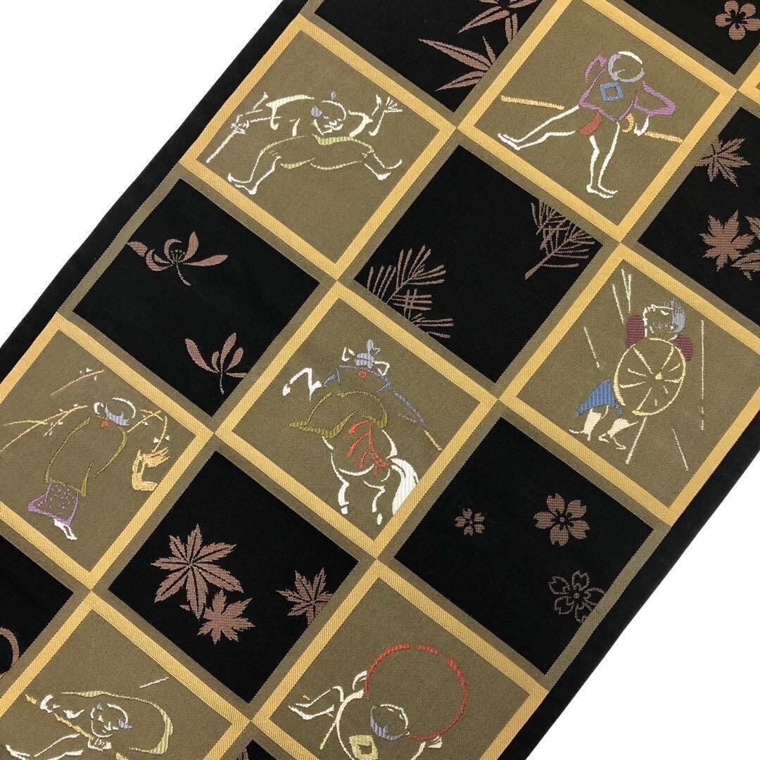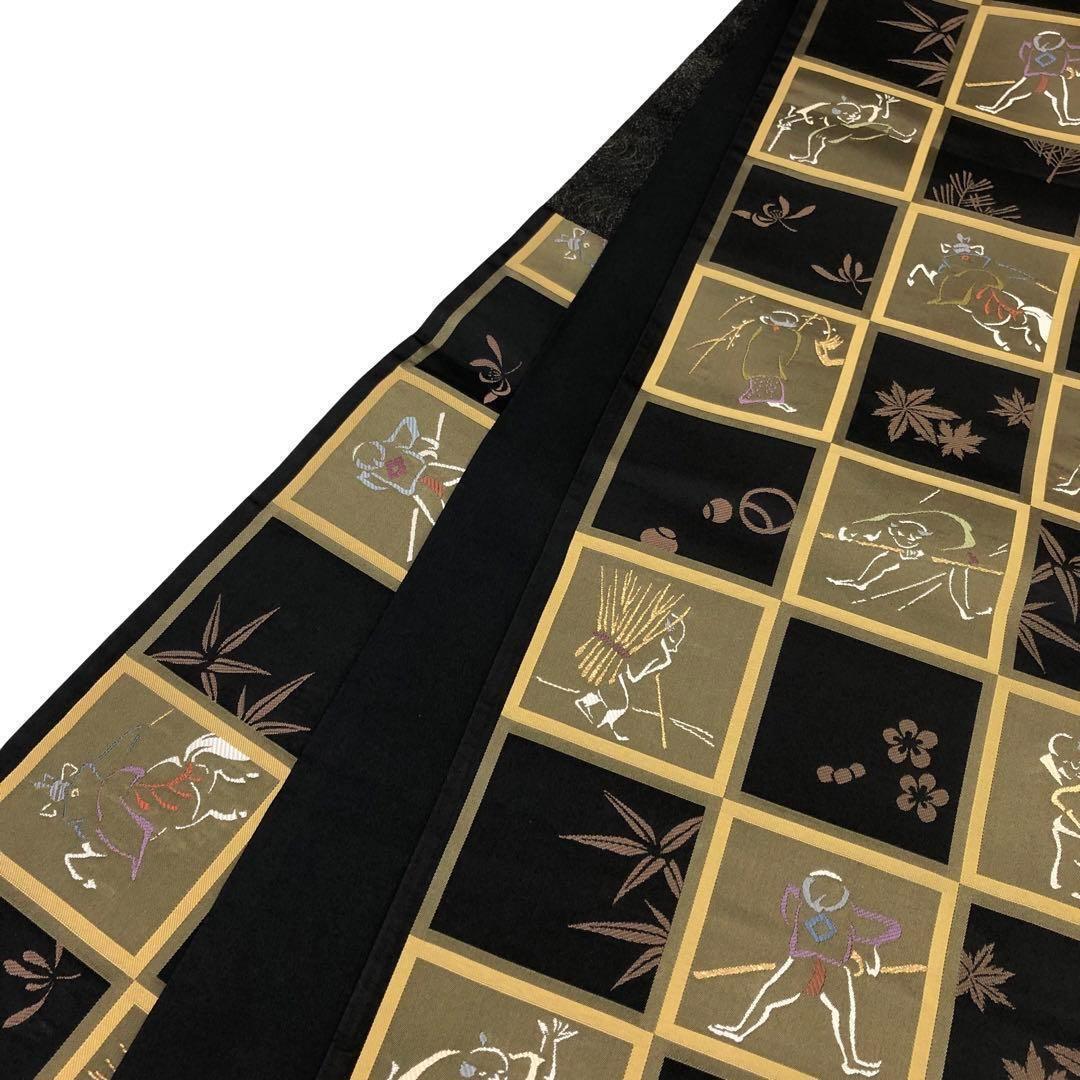 逸品集と題された聚楽糸を使った格子柄に多様な人々や花草の柄裄がデザインされた雰囲気の良い素敵なお品でございます。