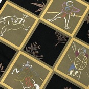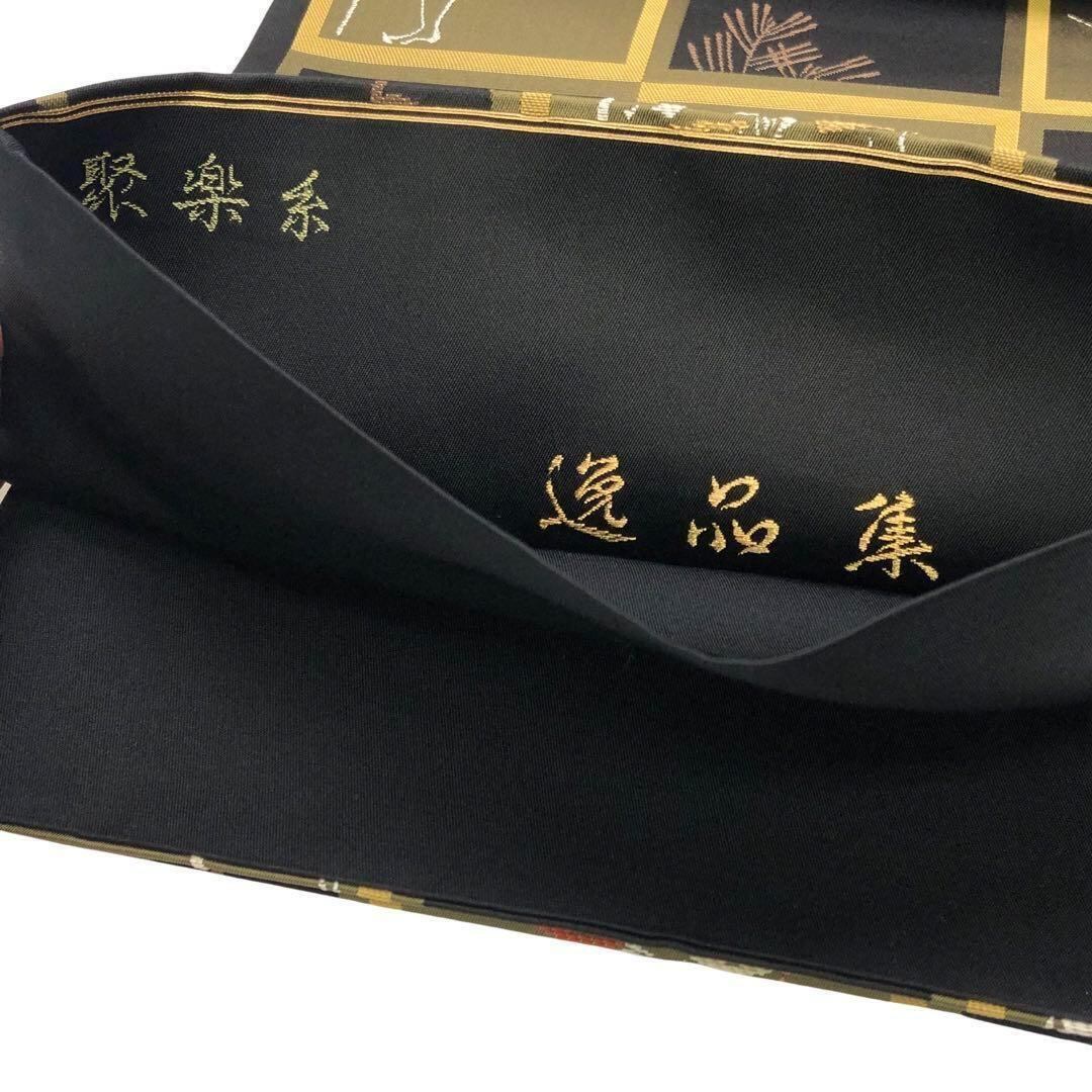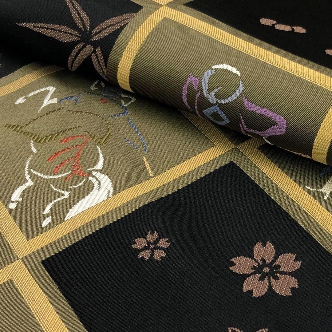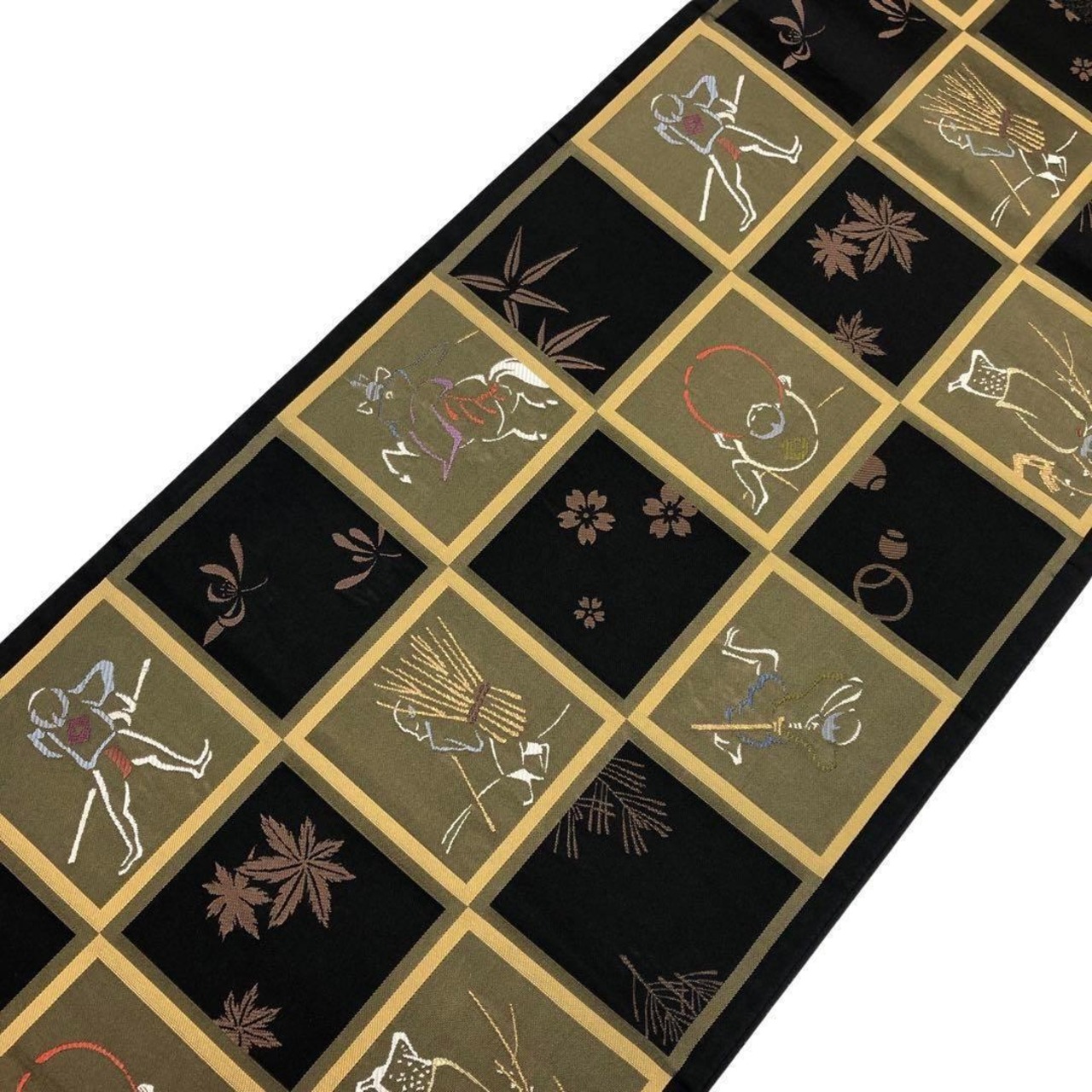 逸品集と題された聚楽糸を使った格子柄に多様な人々や花草の柄裄がデザインされた雰囲気の良い素敵なお品でございます。