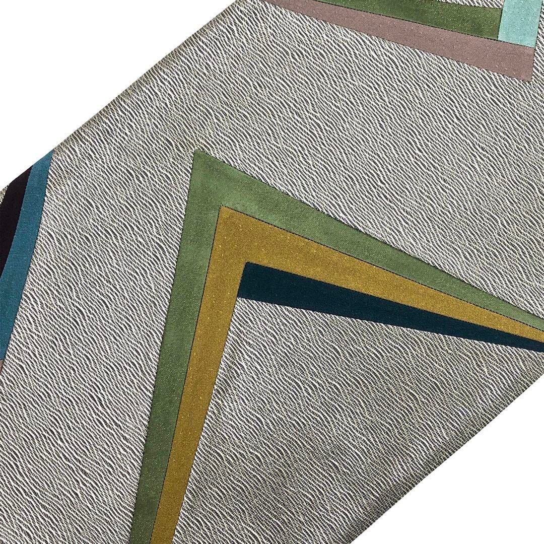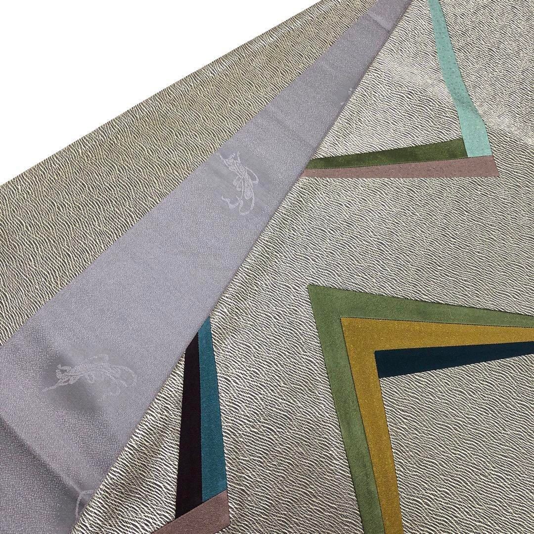 銀糸を使ったすくい織に淡い染色の色彩が美しい幾何学模様の切嵌での柄裄がデザインされたモダンな雰囲気の素敵な柄裄のお品でございます。
