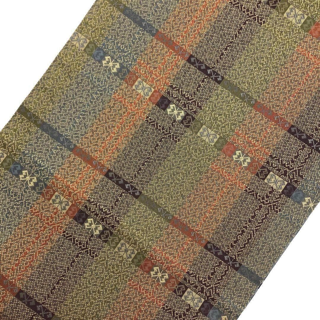 袋帯 リバーシブル 縦縞模様 織模様 格子柄 O-3468 着物 きもの kimono 和服 和装 中古 リサイクル着物 【送料無料】