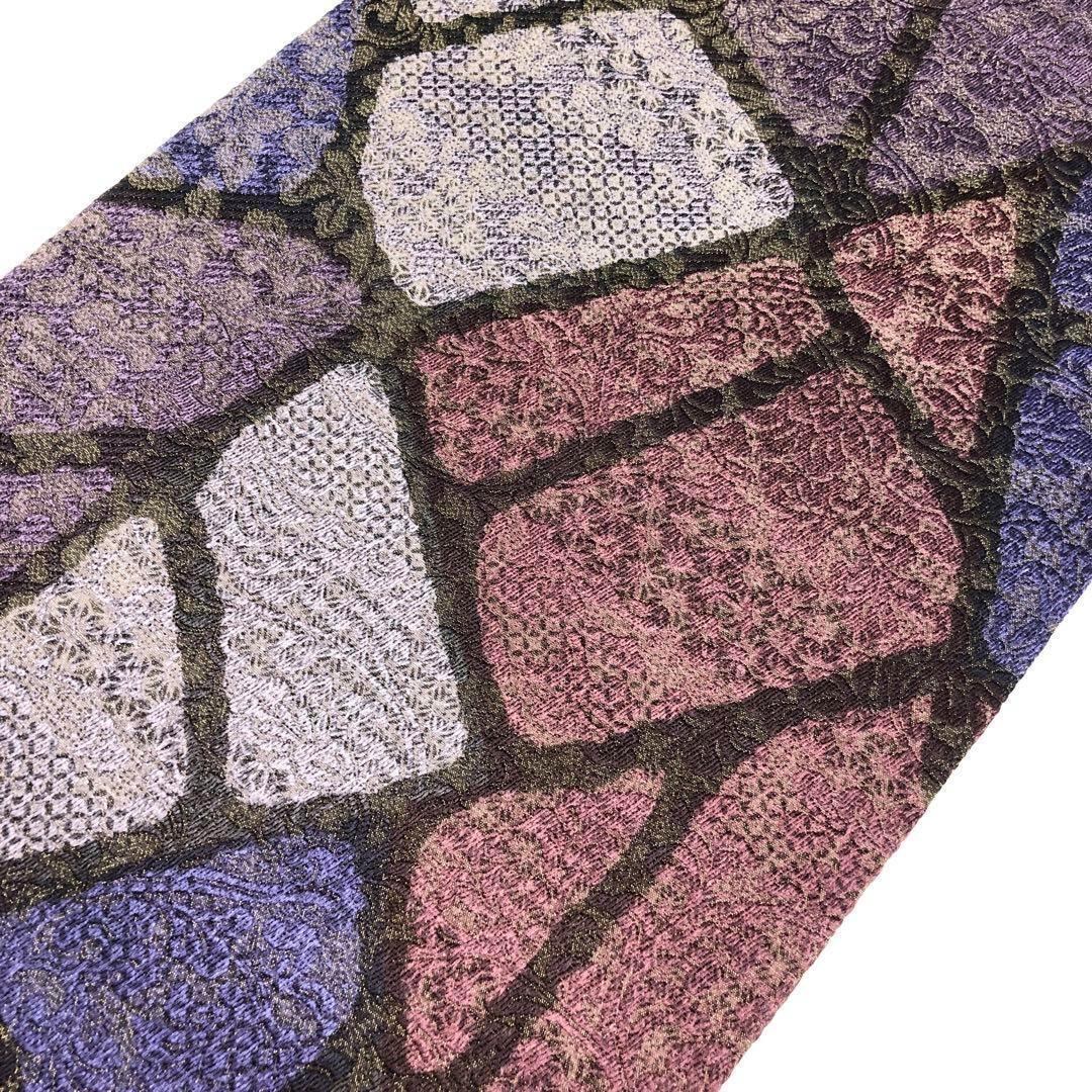 袋帯 石垣模様 寄せ柄 七宝 麻の葉 花唐草 金通し 黒色 O-3485