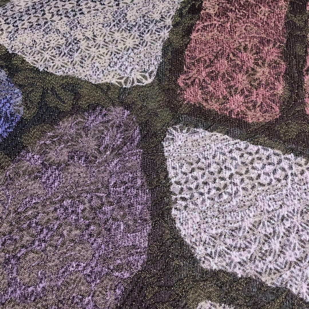 金通しされた石垣模様に七宝、麻の葉、花唐草などの寄せ柄の織模様でデザインされた素敵な柄裄のお品でございます。