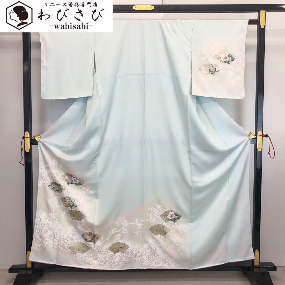 淡水色の透き通るようなお色味に暈し、金銀彩が使われた地紙に花模様の美しい柄裄の素敵なお品でございます。