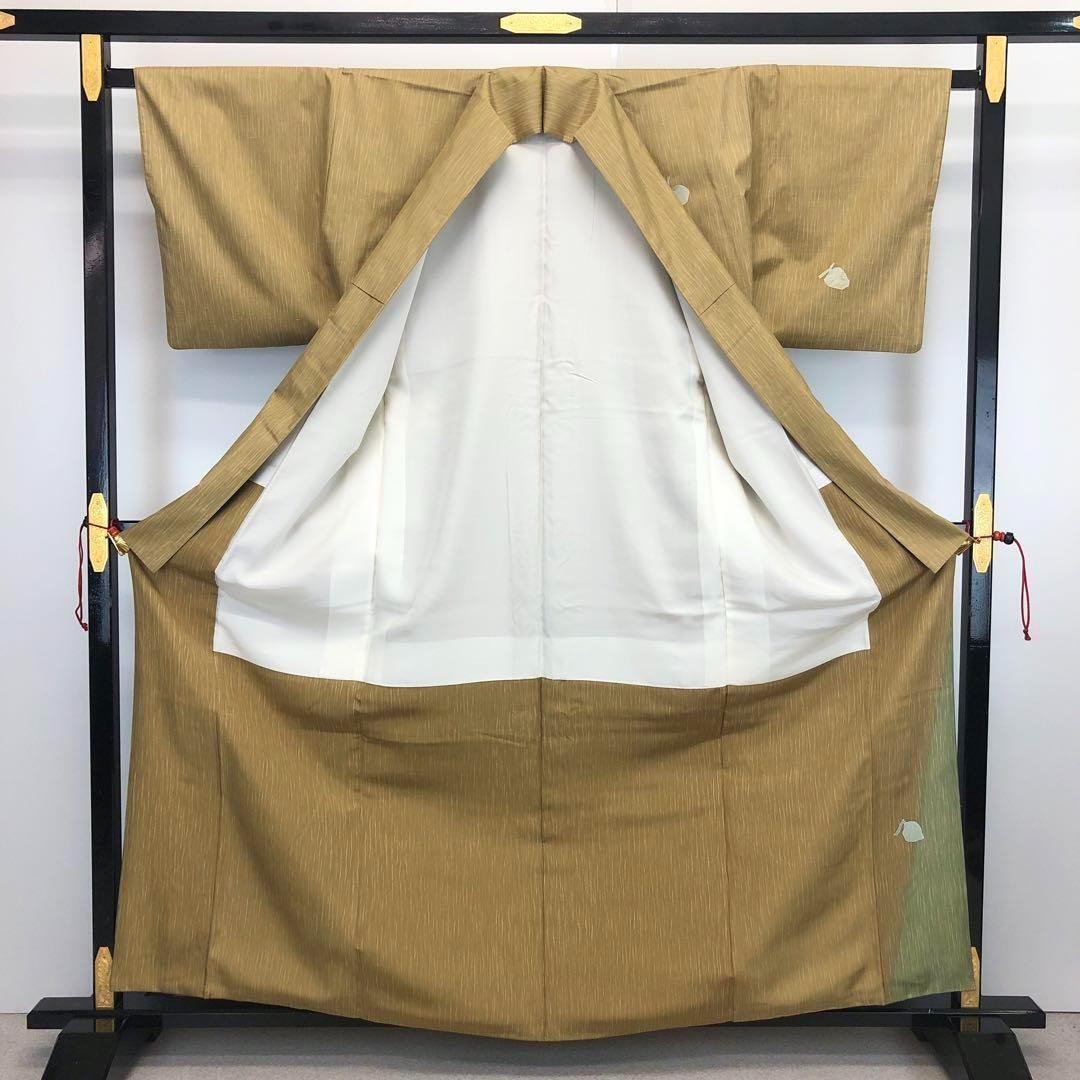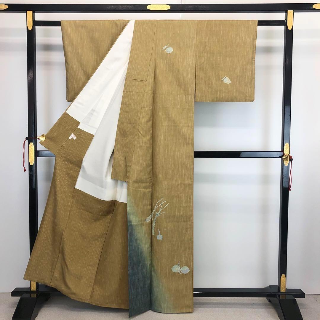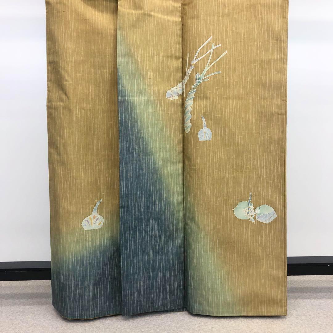 梨子色ベースの落ち着きのあるお色味に暈し、縦縞模様、山葵や慈姑などの野菜の柄裄がデザインされた素敵なお品でございます。