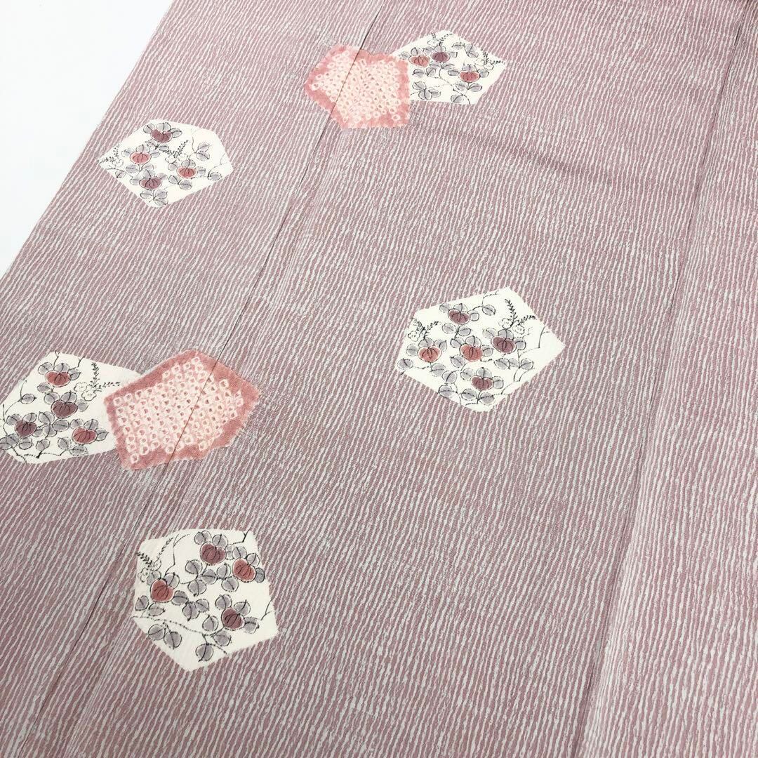 浅紅色の品のあるお色味に縦縞模様、五角形に橘の花柄、鹿の子模様の柄裄がデザインされた素敵なお品でございます。