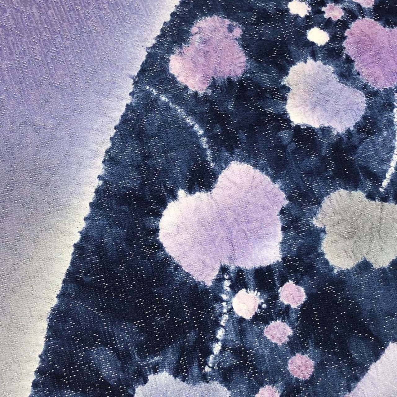 銀通しされた胆色ベースの美しいグラデーション、芯有ですが柔らかめの締めやすい、暈しの染色に絞りの葡萄柄がデザインされた素敵な柄裄のお品でございます。