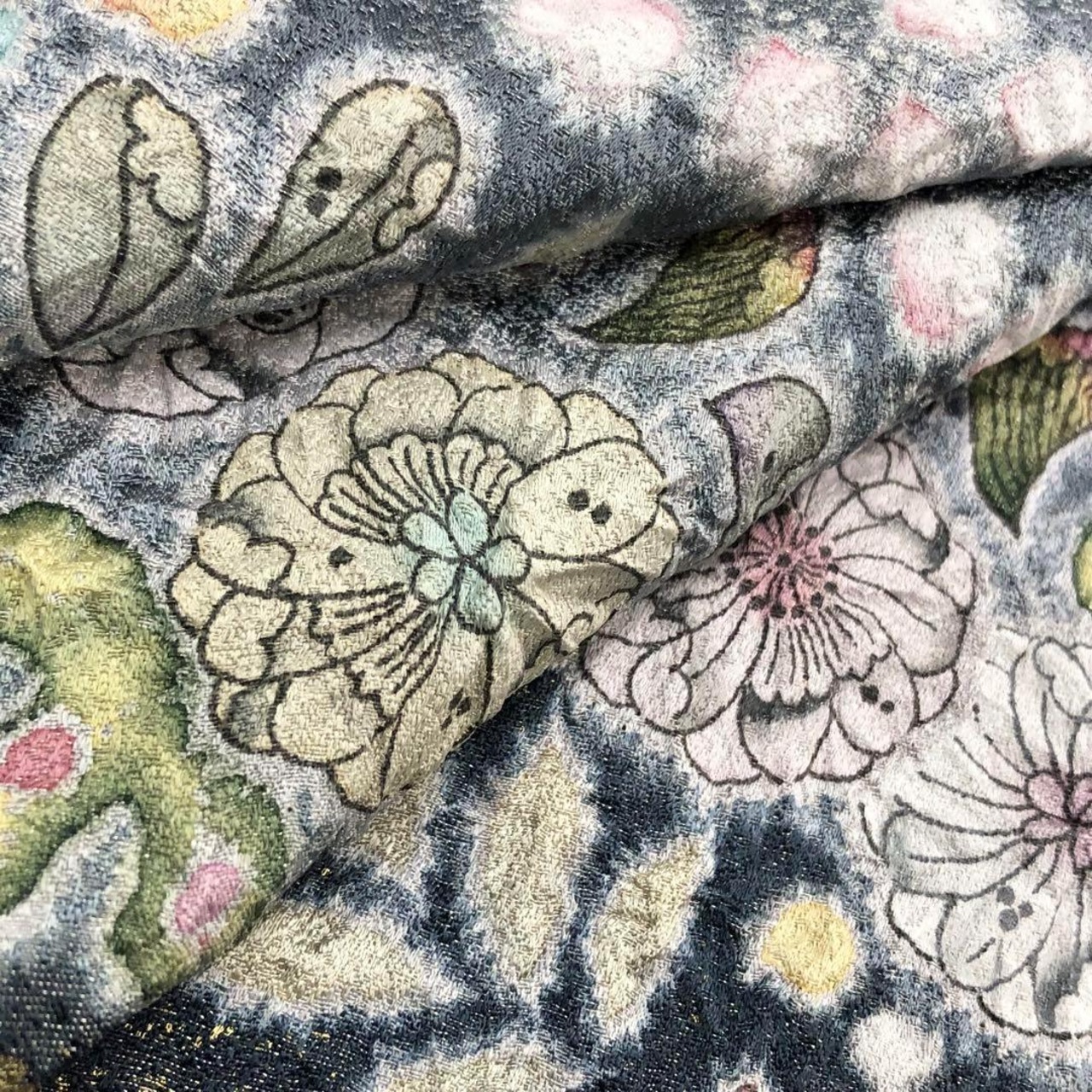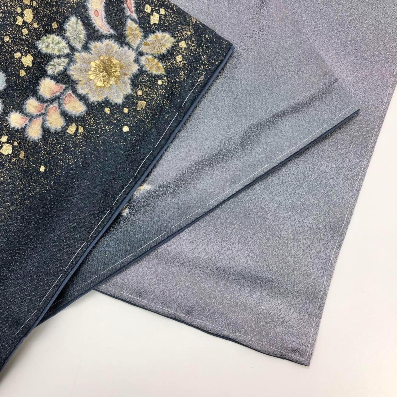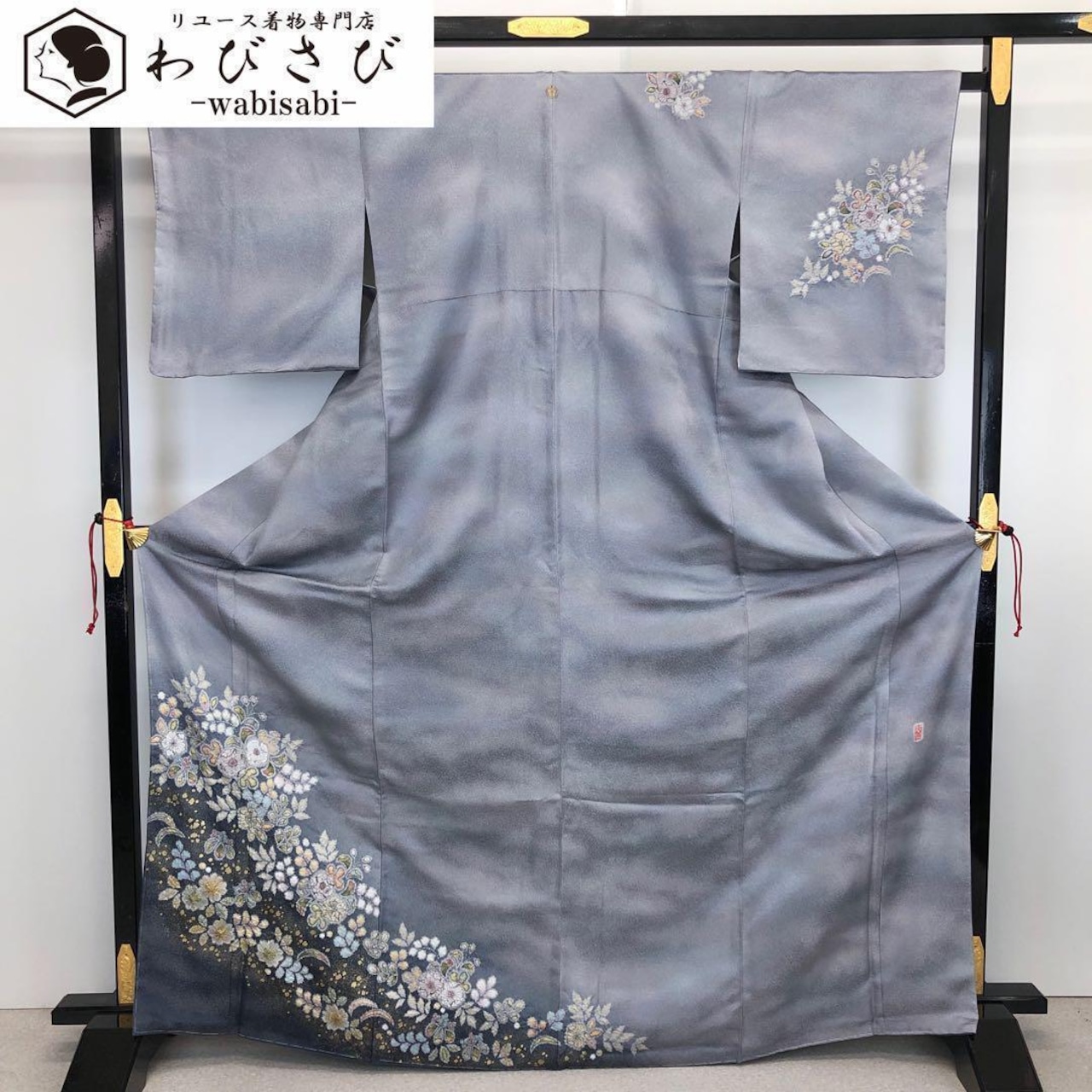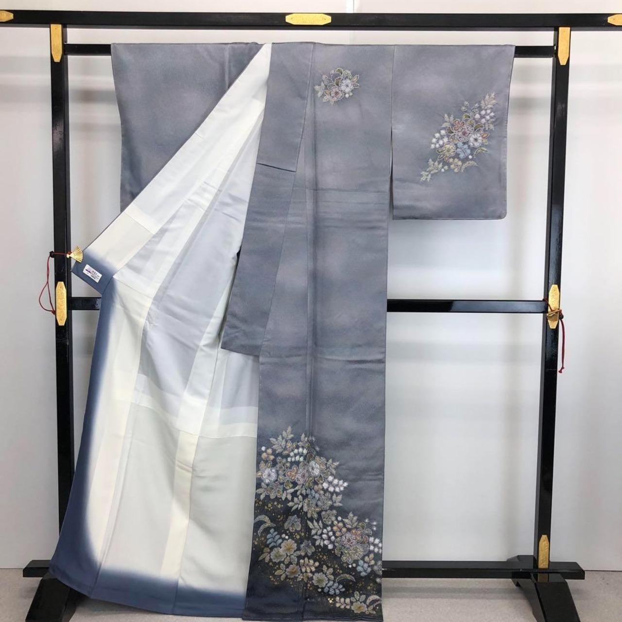 薄鈍色の落ち着きのあるお色味に淡い暈し、金彩が使われた美しく上品な辻が花絞りの柄裄がデザインされた素敵なお品でございます。