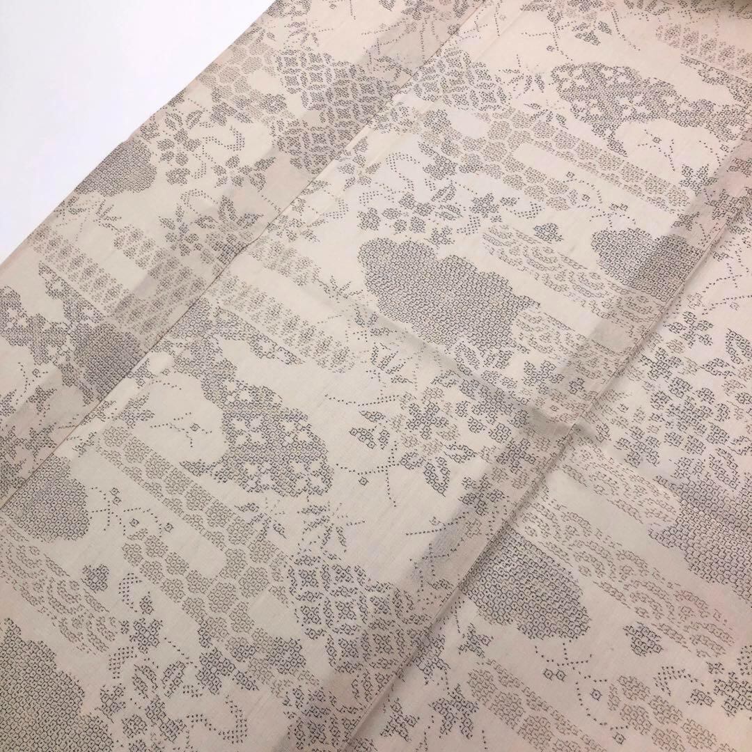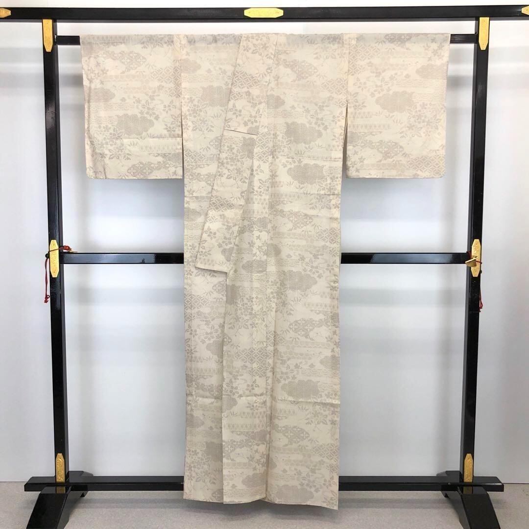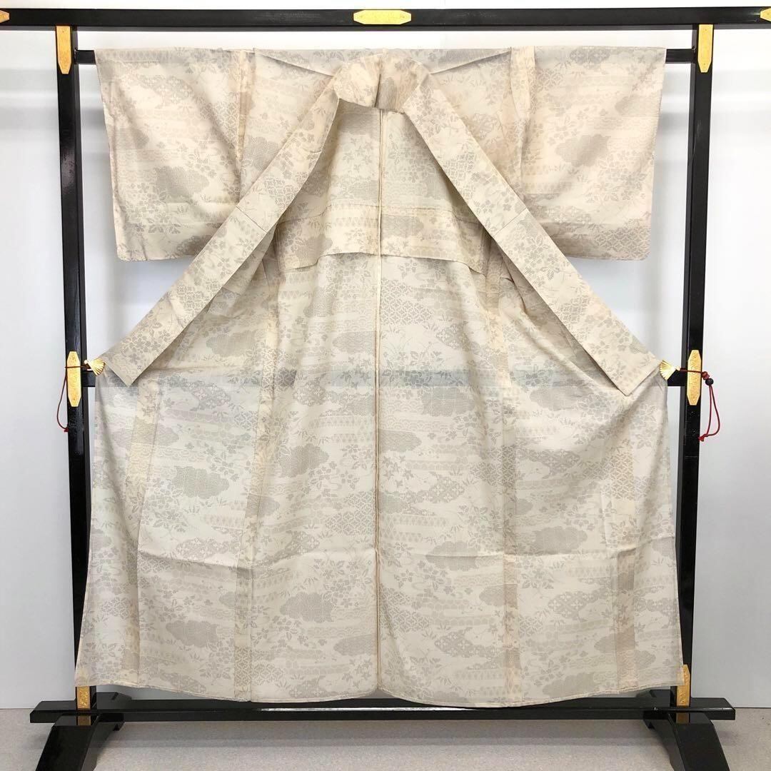 伝統工芸士西川治郎、素色の自然な雰囲気のお色味の100亀甲、雲に七宝繋ぎや花模様の柄裄がデザインされた素敵なお品でございます。