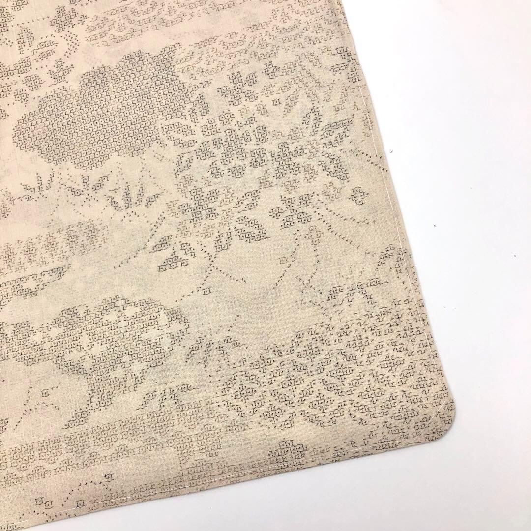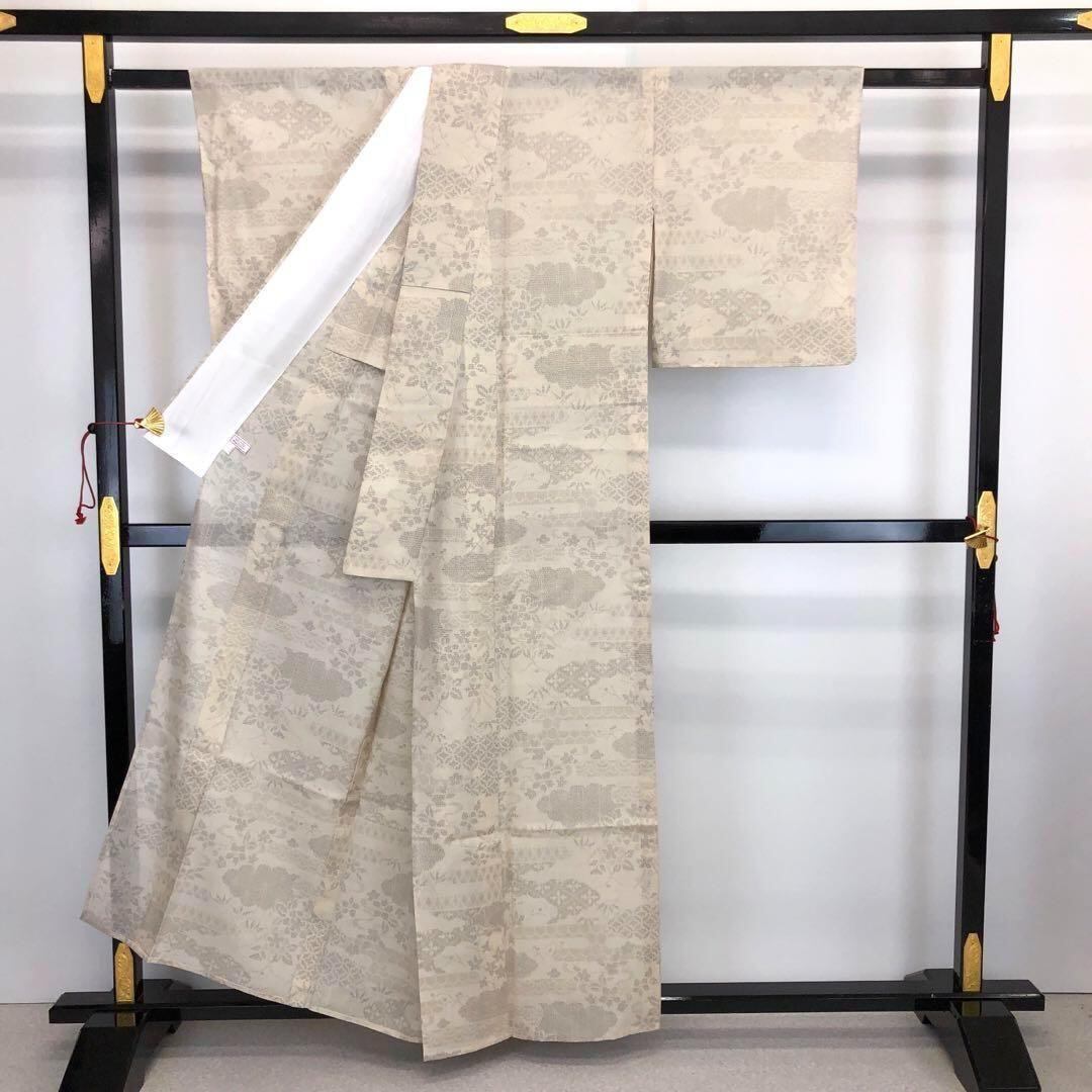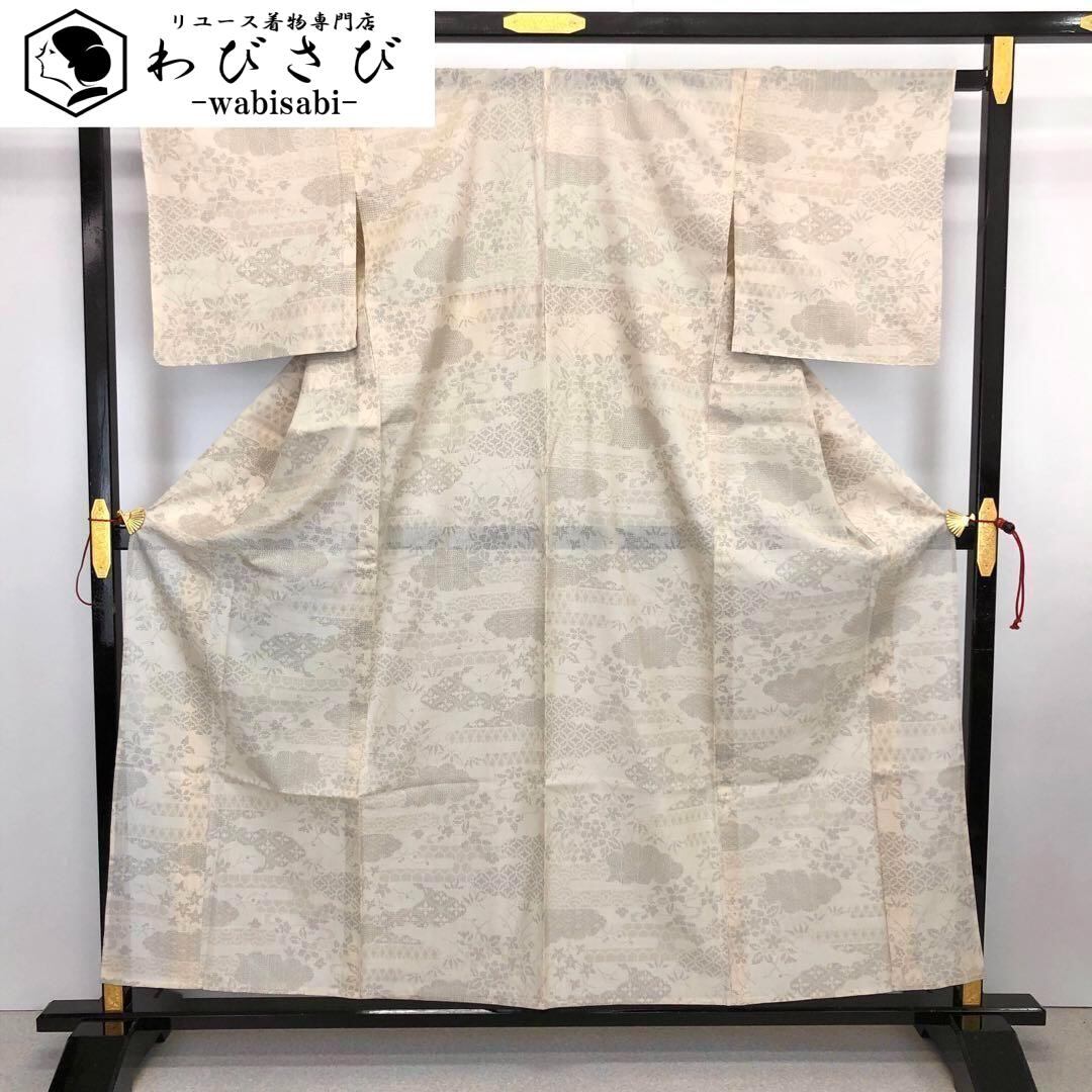 伝統工芸士西川治郎、素色の自然な雰囲気のお色味の100亀甲、雲に七宝繋ぎや花模様の柄裄がデザインされた素敵なお品でございます。