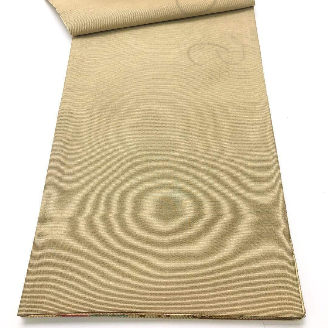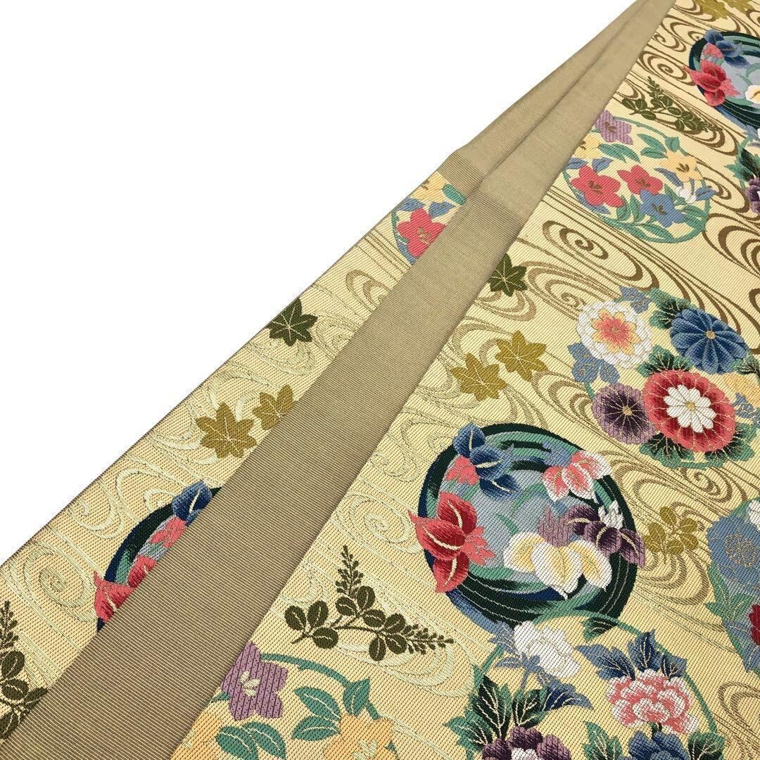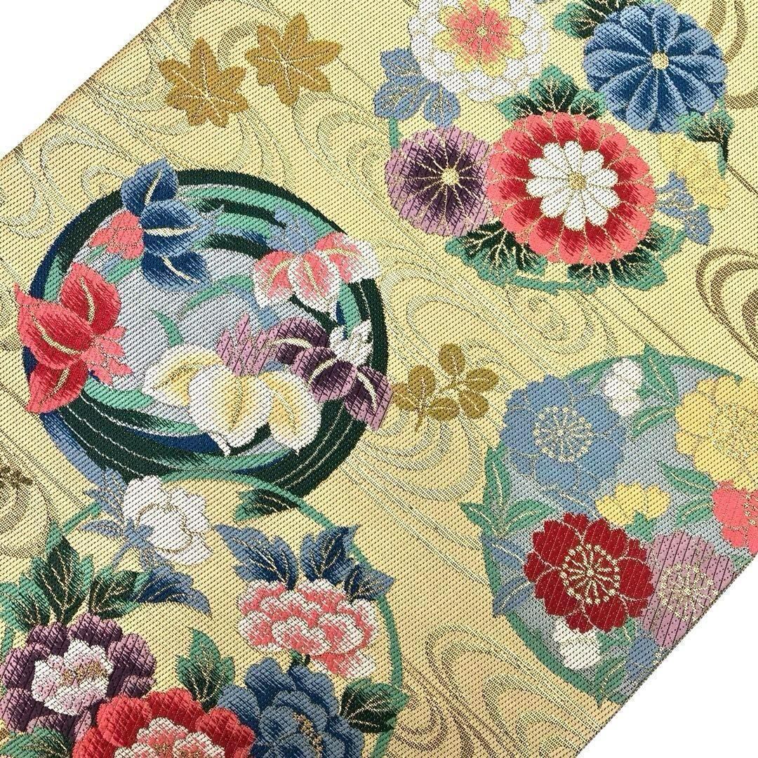 袋帯 彩り鮮やかな四季の花柄 流水模様 金糸 支子色 O-3463 着物 きもの kimono 和服 和装 中古 リサイクル着物 【送料無料】