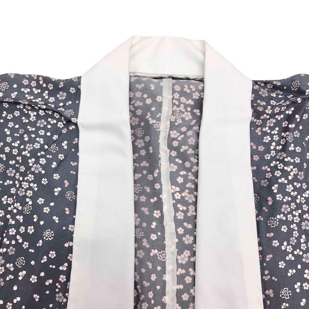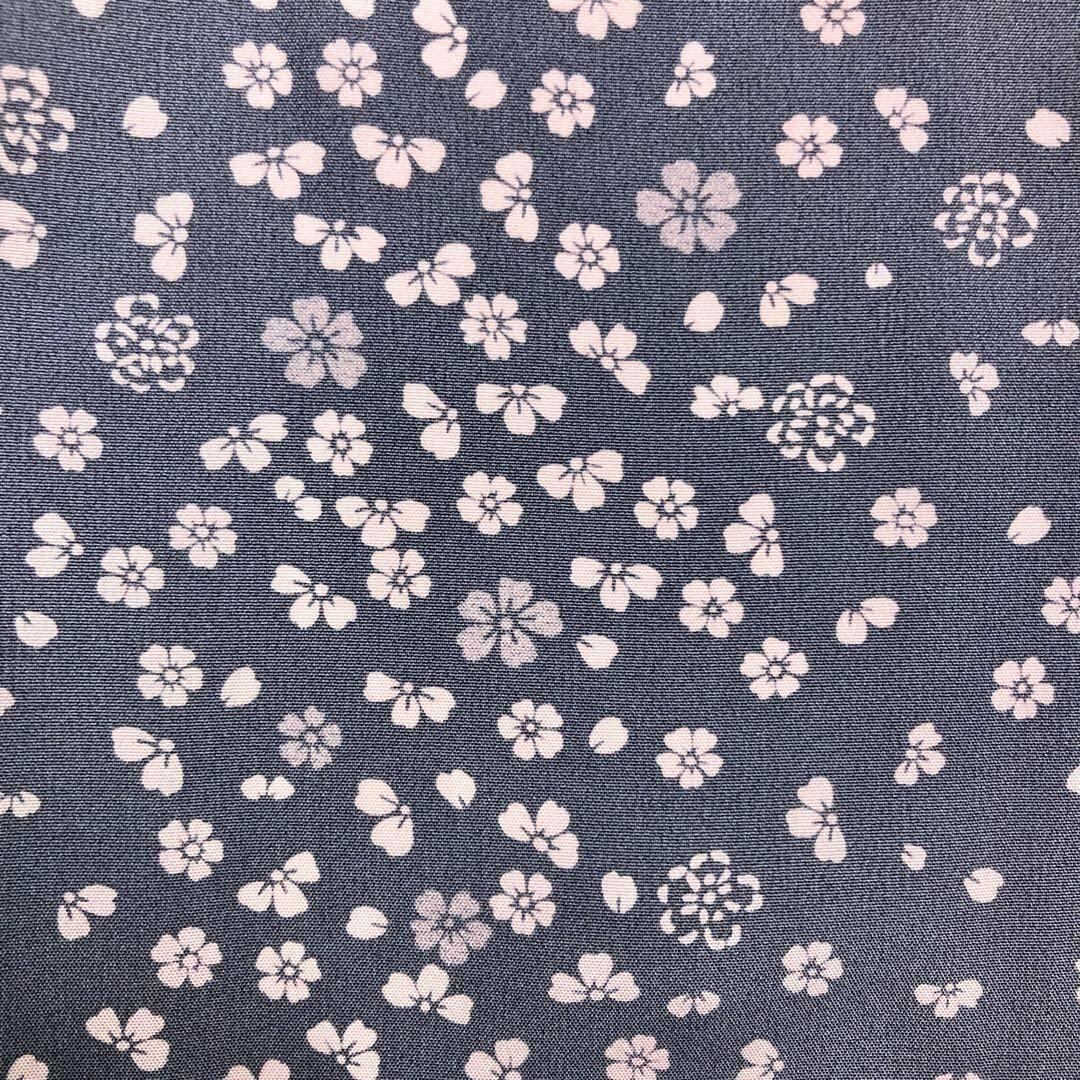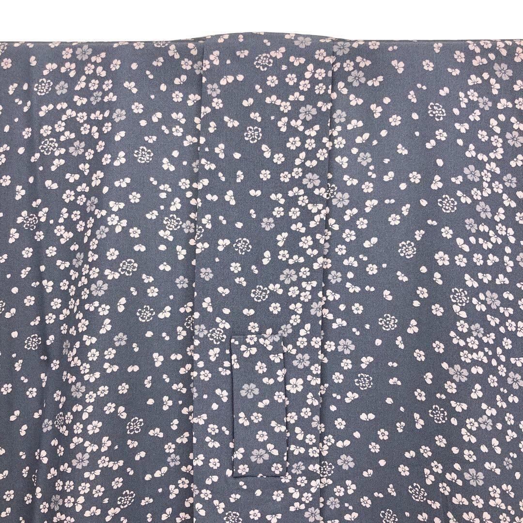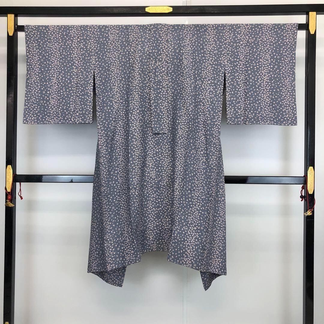 鉛色の落ち着きのあるお色味に小さな桜の花模様がデザインされた素敵な柄裄のお品でございます。